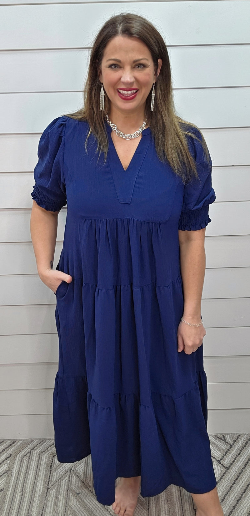 NAVY SOLID V NECK MIDI TIERED DRESS W/ SMOCKED SLEEVE