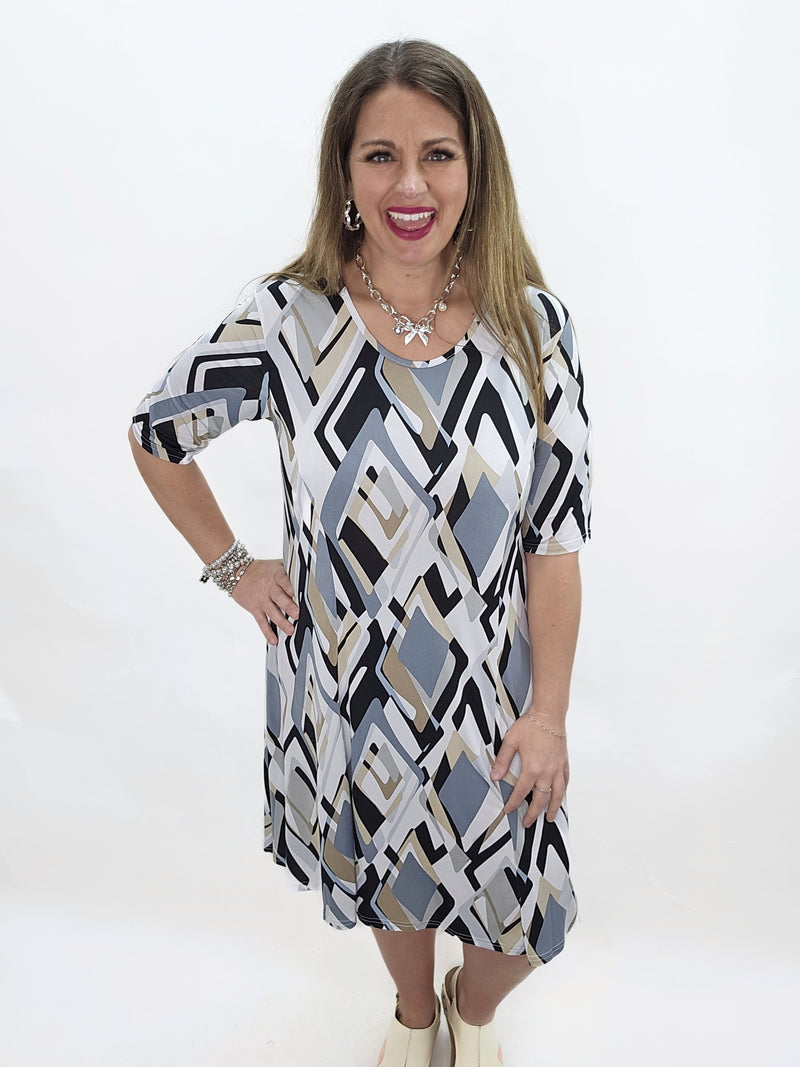 DEAR SCARLETT BLACK/TAUPE PAISLEY 3/4 SLEEVE DRESS