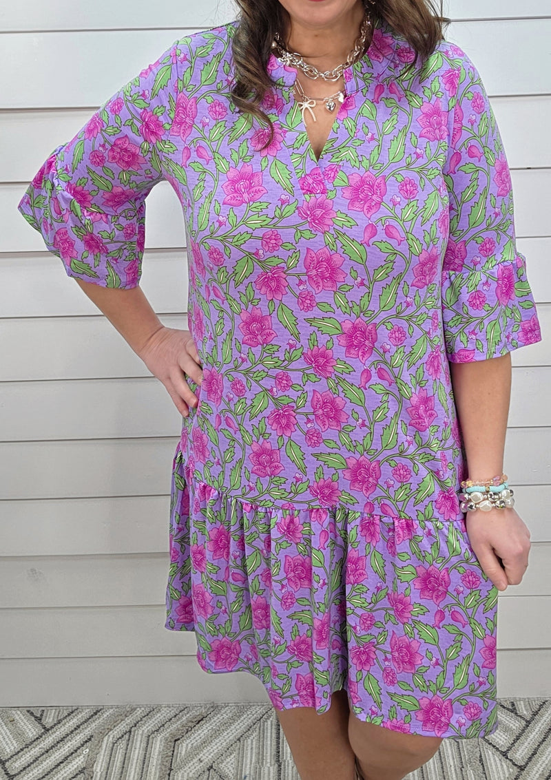 DEAR SCARLETT SUNDAY 3/4 SLEEVE RUFFLE DETAIL DRESS - ORCHID FLORAL