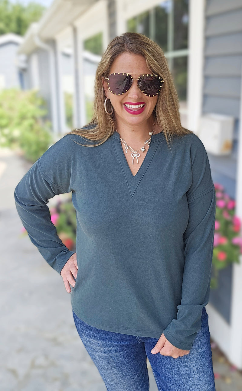 HUNTER GREEN FRENCH TERRY LONG SLEEVE TOP