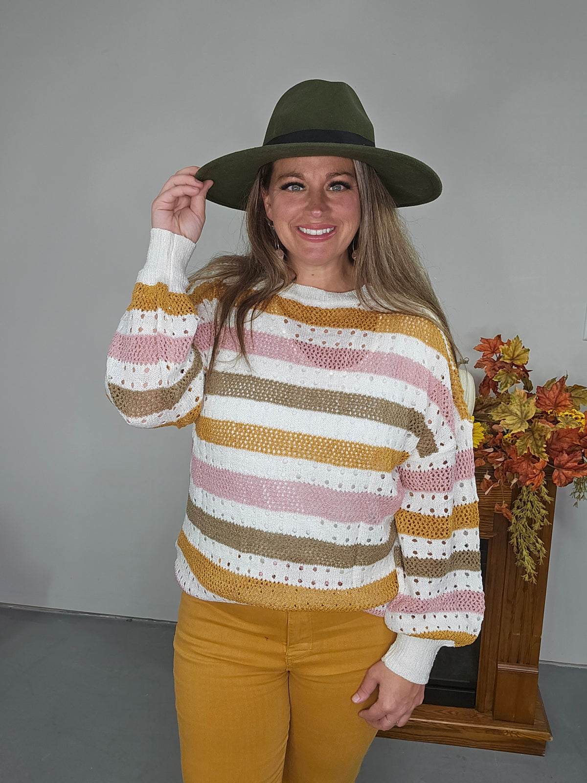 TEAL BLANKET STITCH STRIPED CREW NECK PULLOVER SWEATER