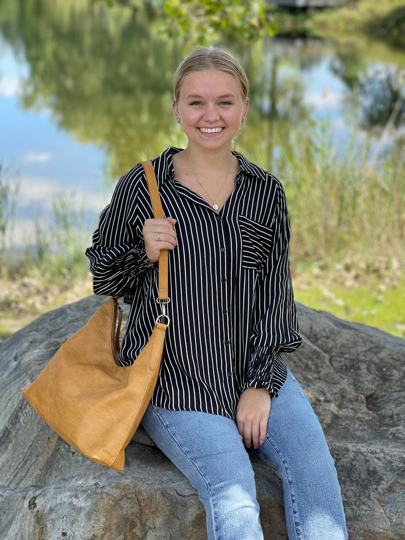 NAVY STRIPED OVERSIZED TOP W/ PINK RAISED RIBBED TRIM