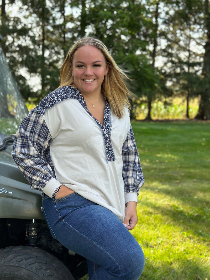 GREY WAFFLE TEXTURE TOP W/ PLAID CONTRAST