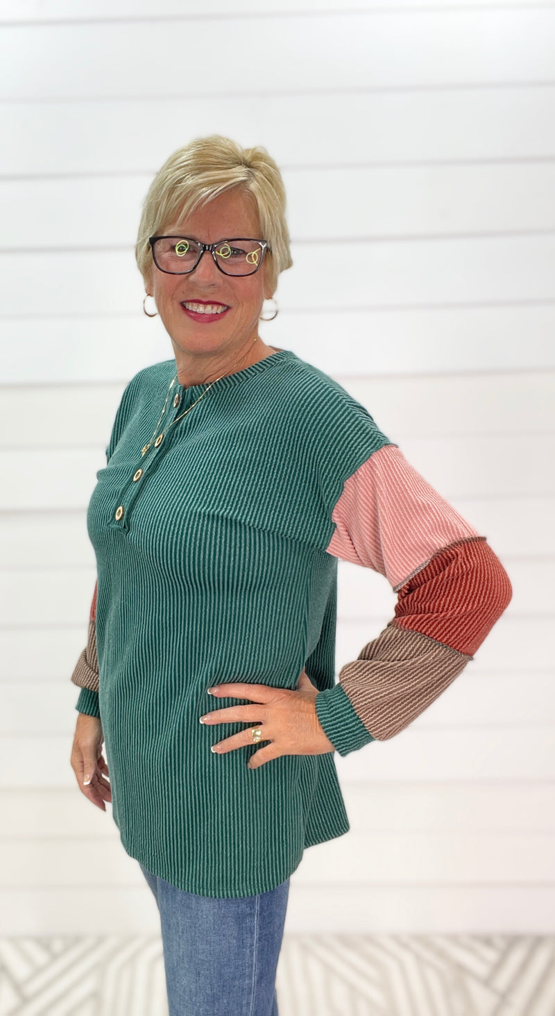HUNTER GREEN RAISED RIBBED HENELY COLORBLOCK LONG SLEEVE KNIT TOP