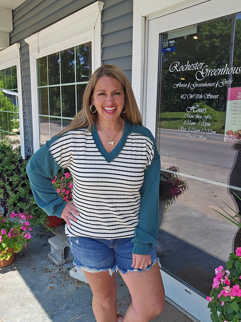 STRIPED/HUNTER TEXTURED/RAISED RIBBED LONG SLEEVE KNIT TOP