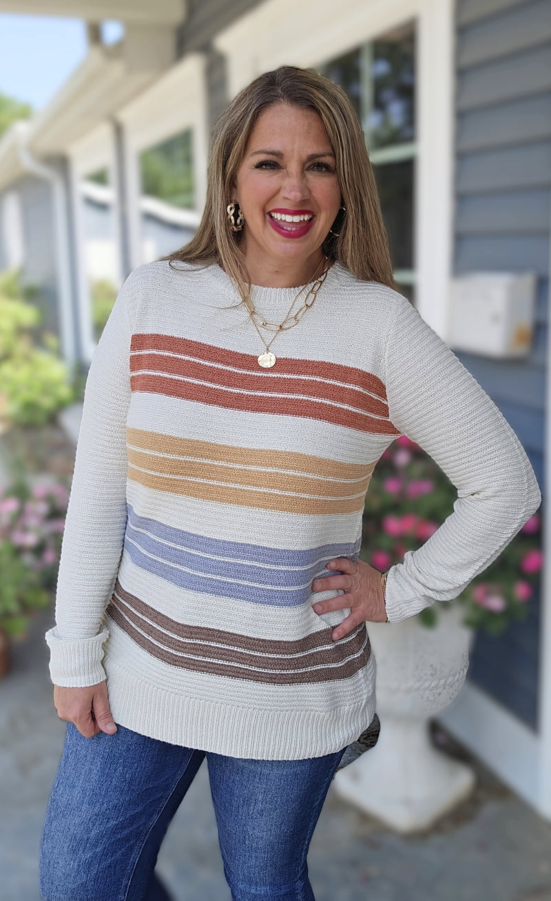 OATMEAL MULTI COLOR STRIPE COLOR BLOCK SWEATER