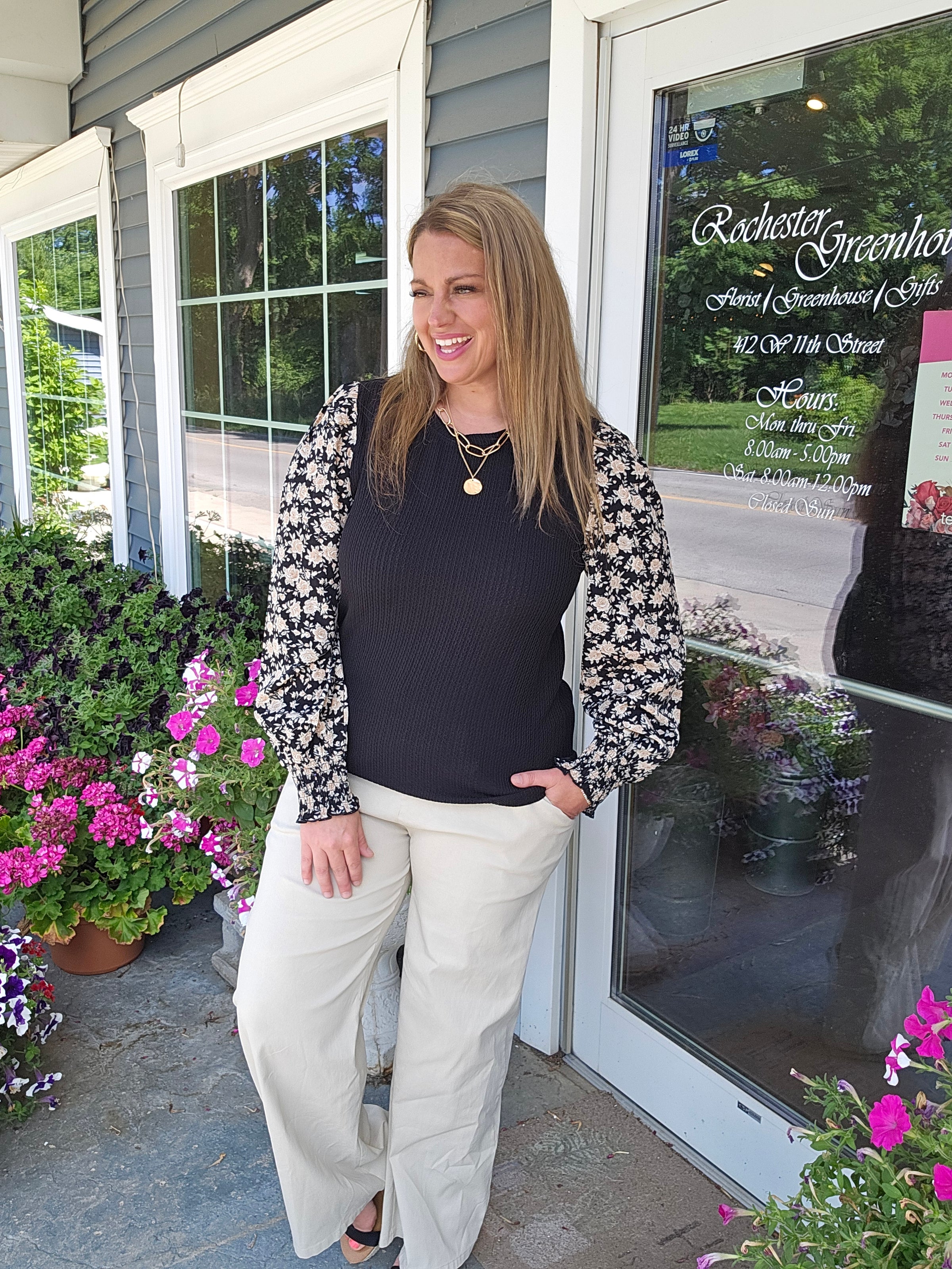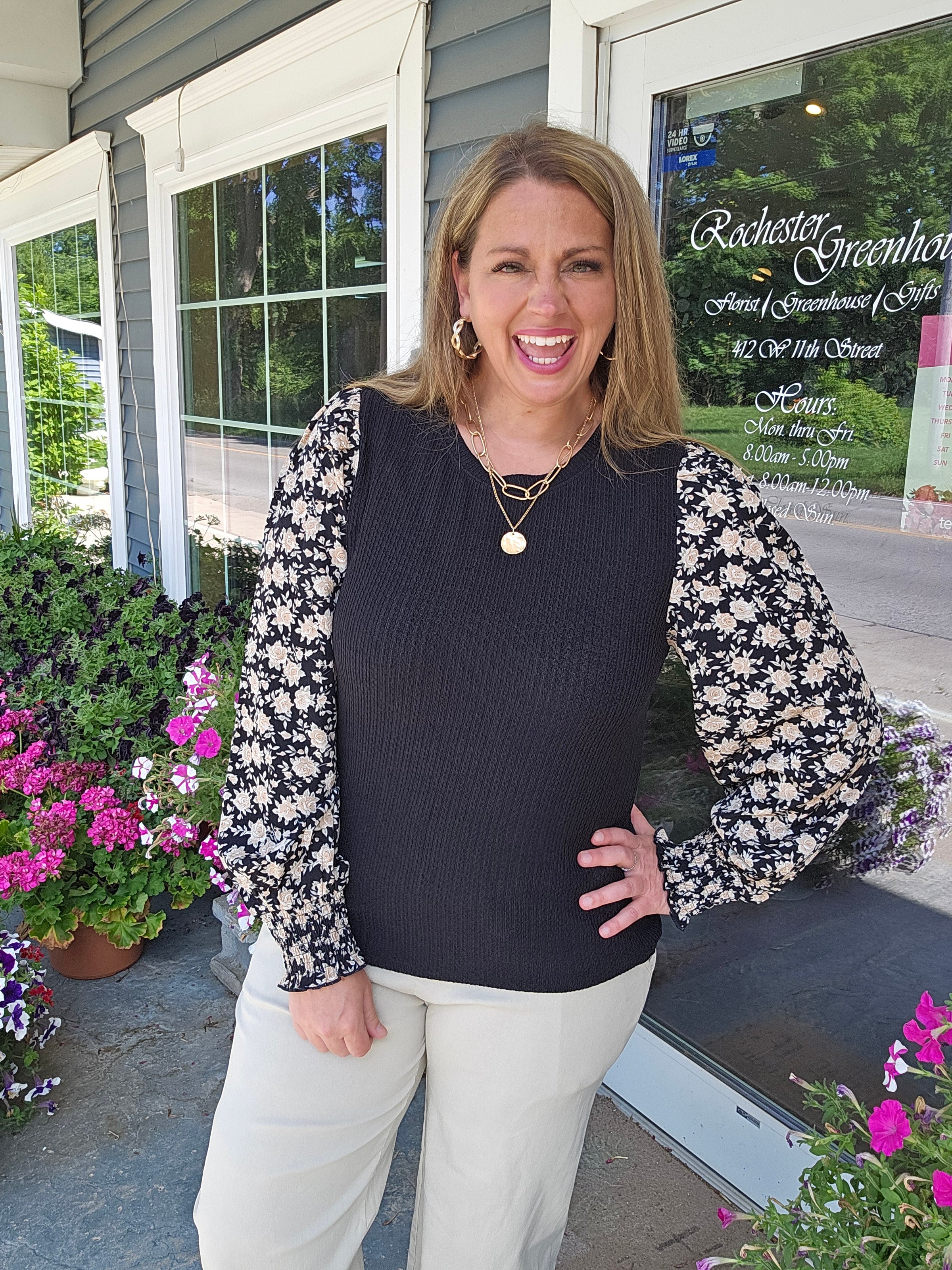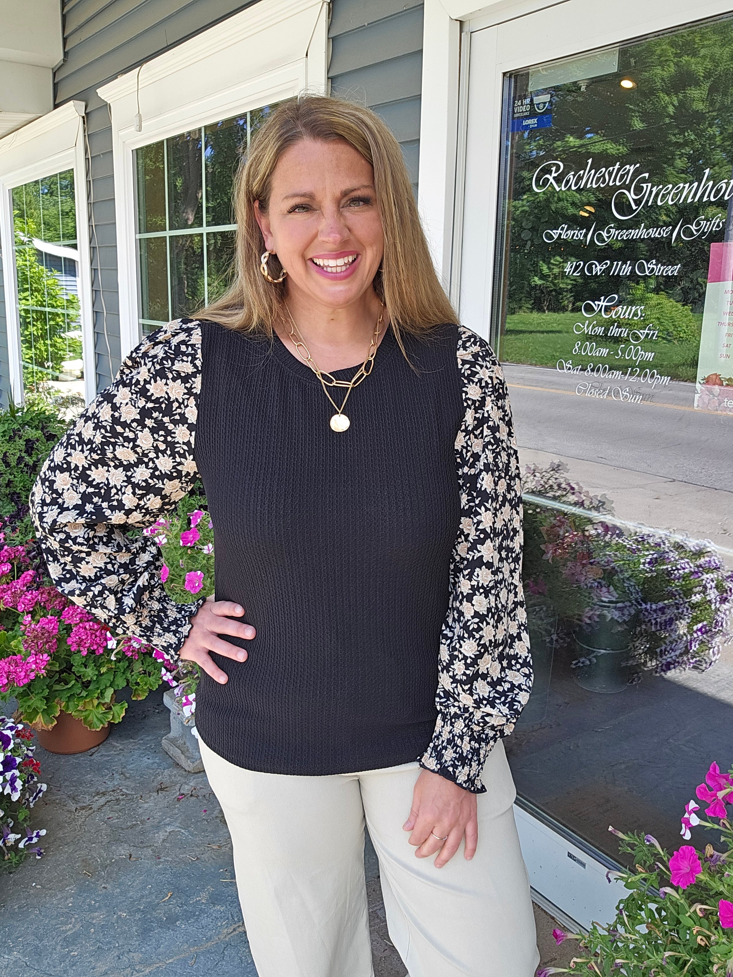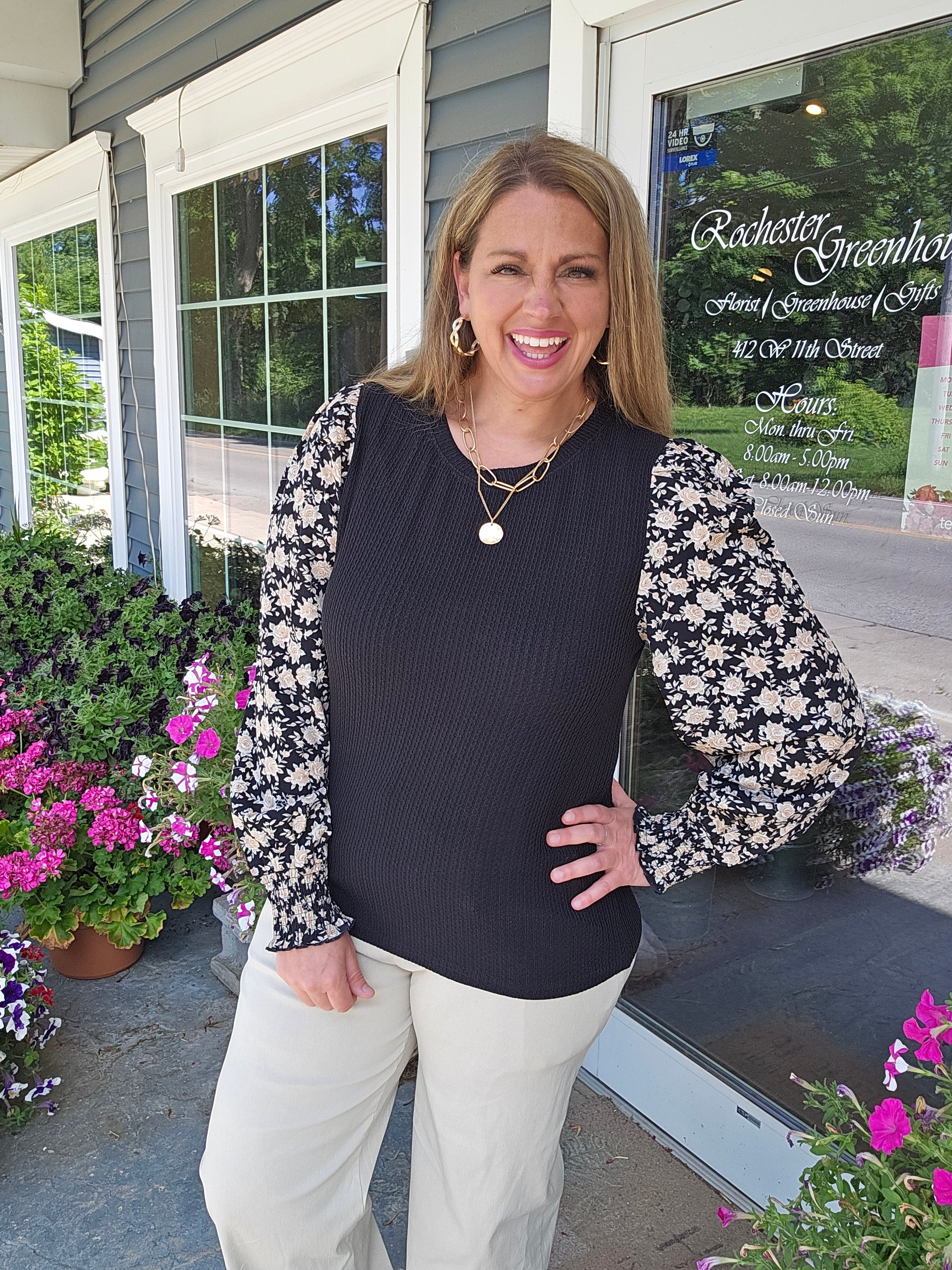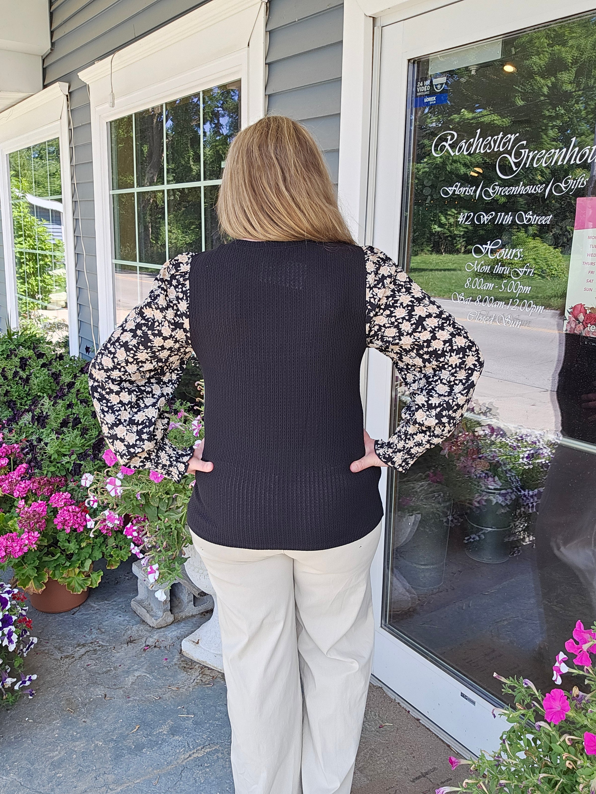 BLACK TEXTURED TOP WITH WOVEN FLORAL SMOCKED CUFF SLEEVE