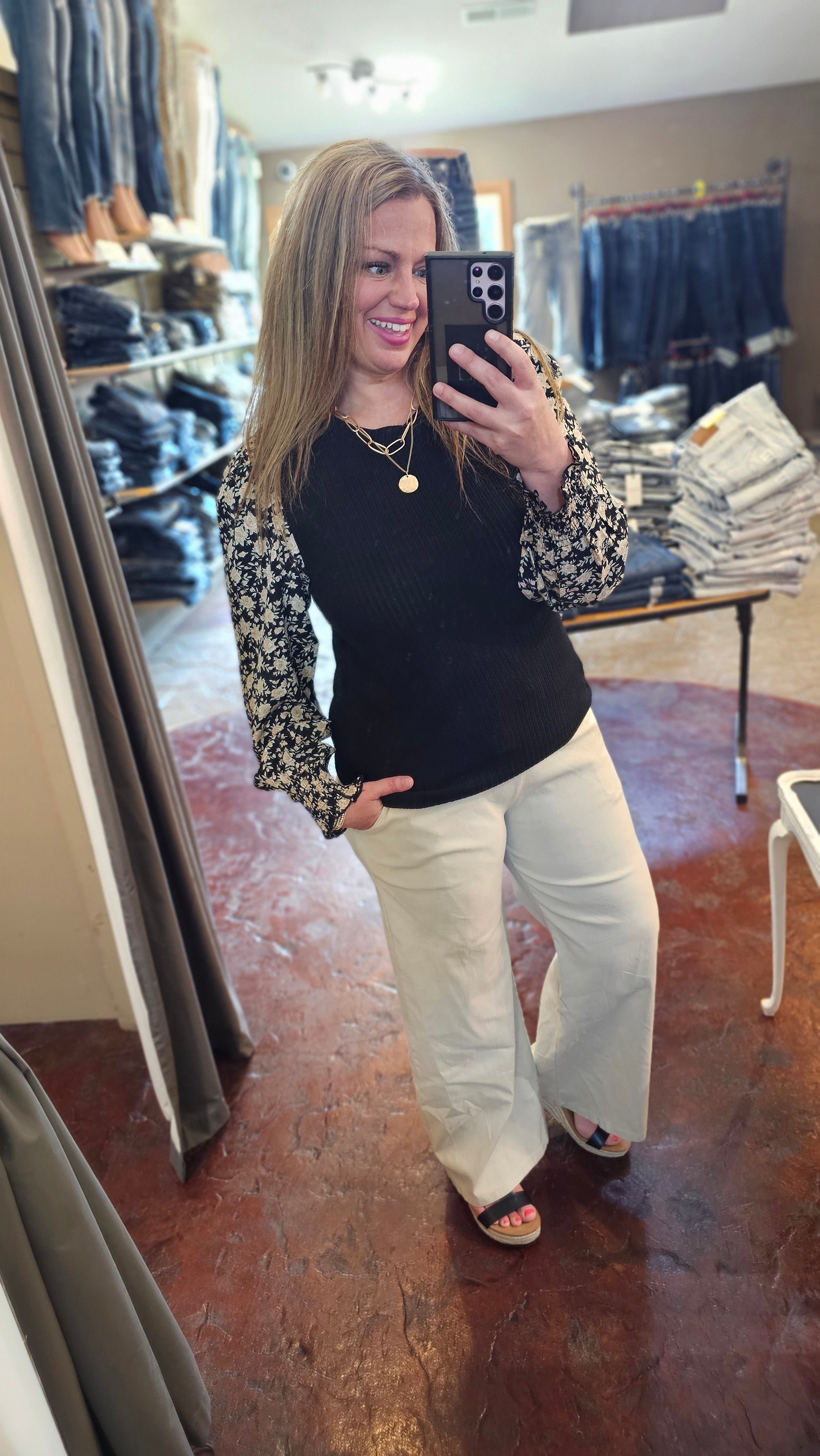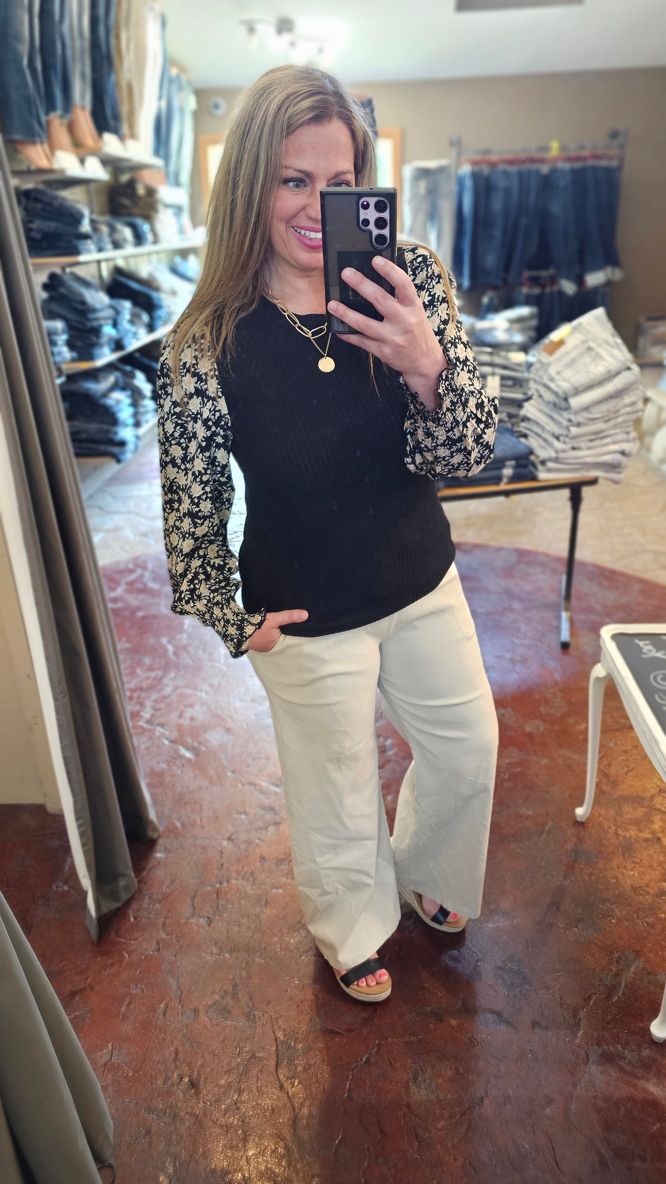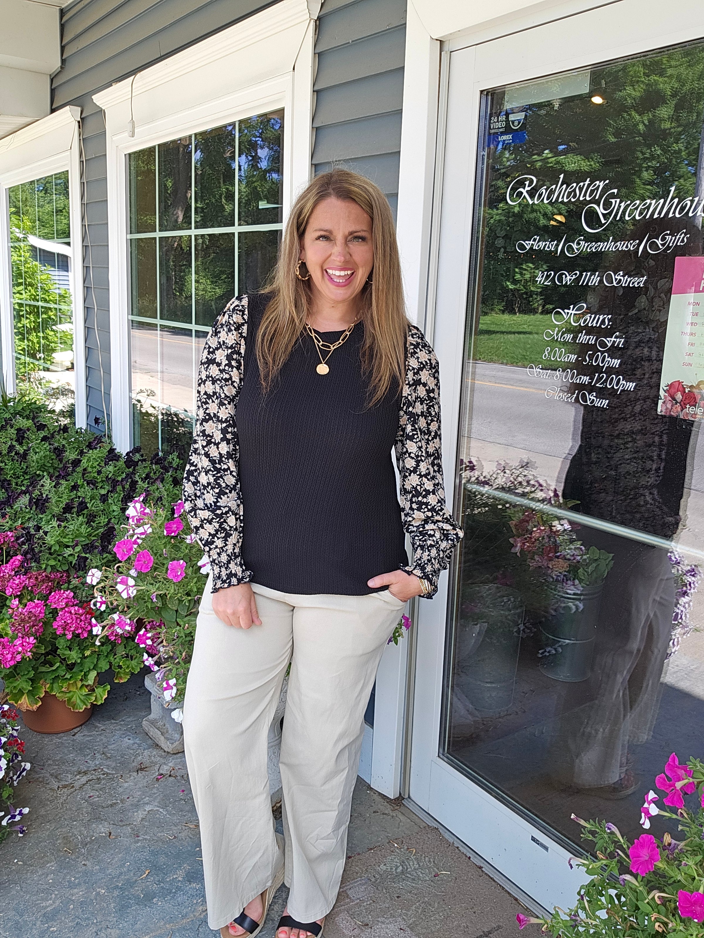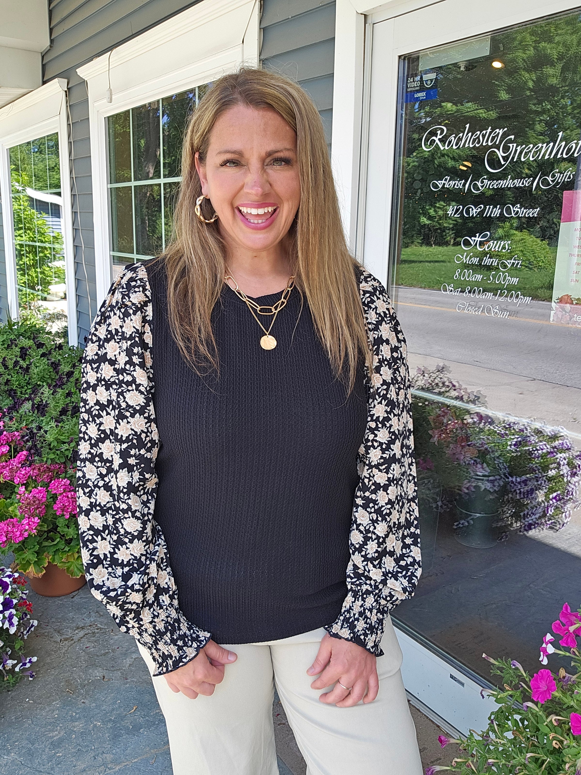 BLACK TEXTURED TOP WITH WOVEN FLORAL SMOCKED CUFF SLEEVE
