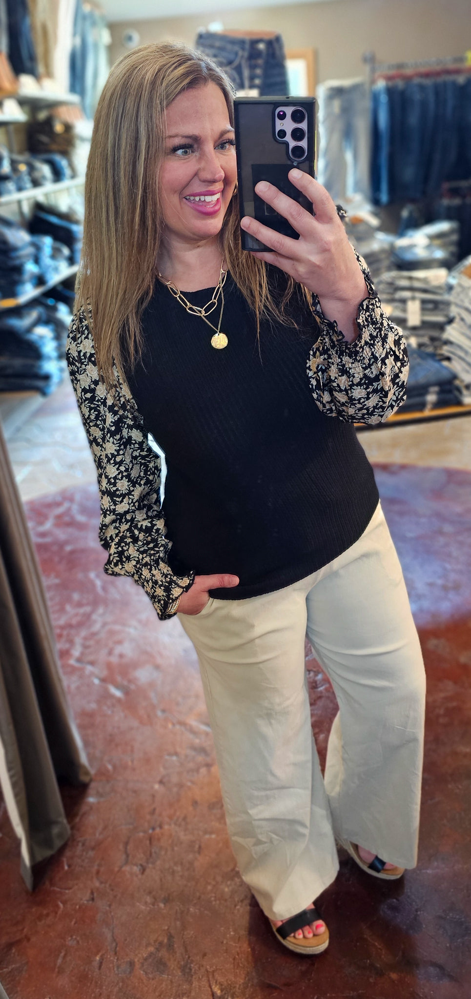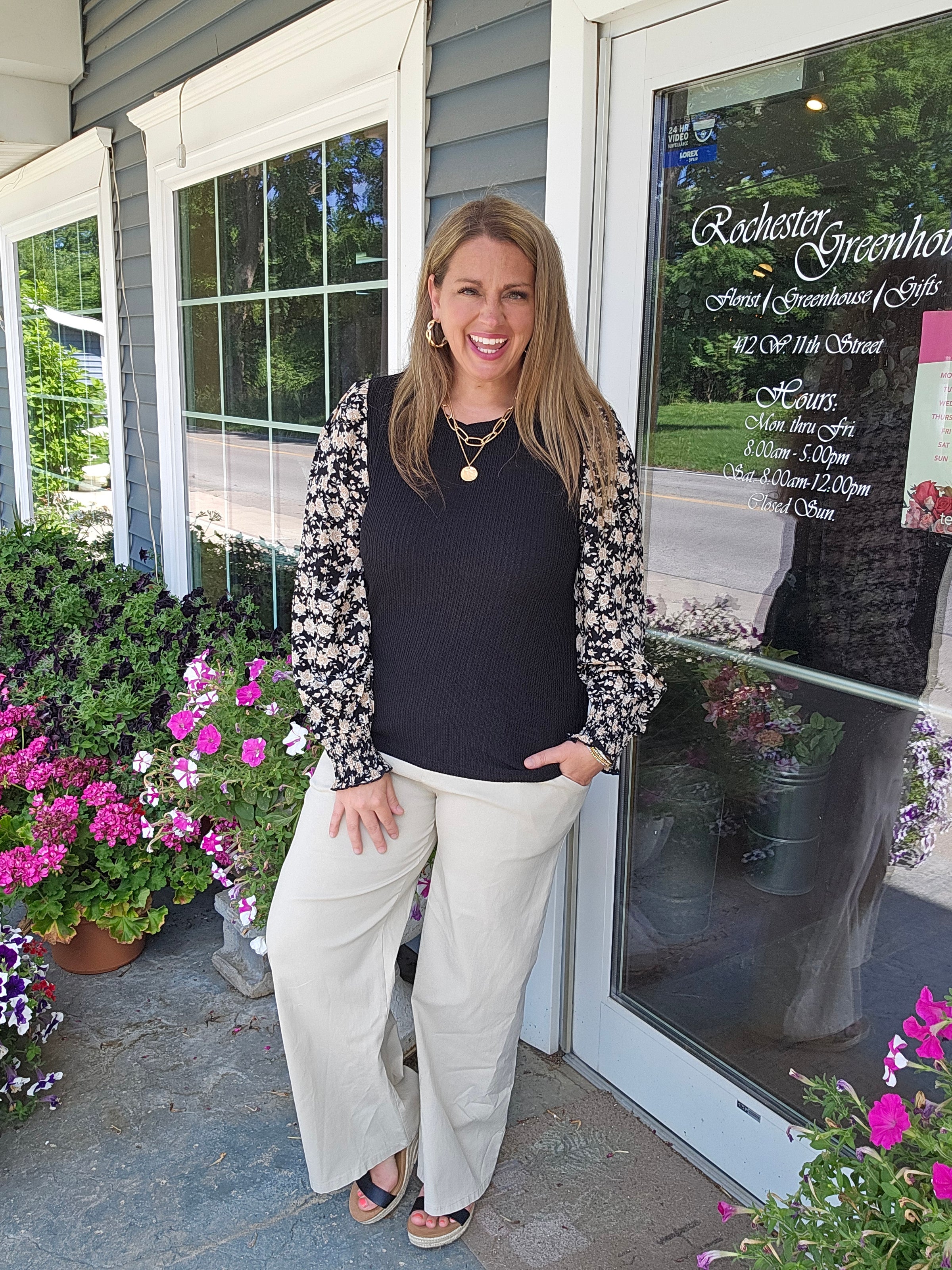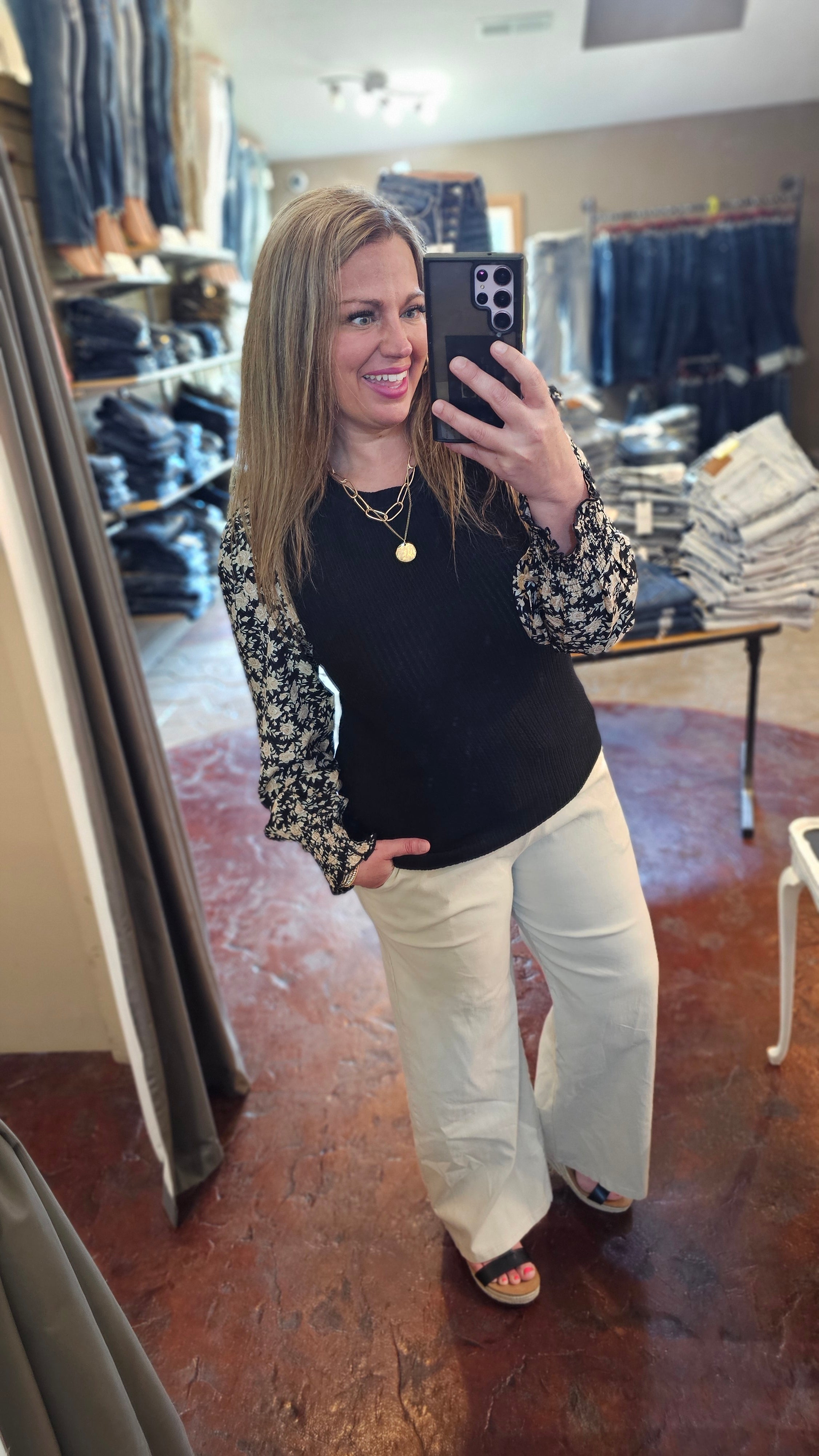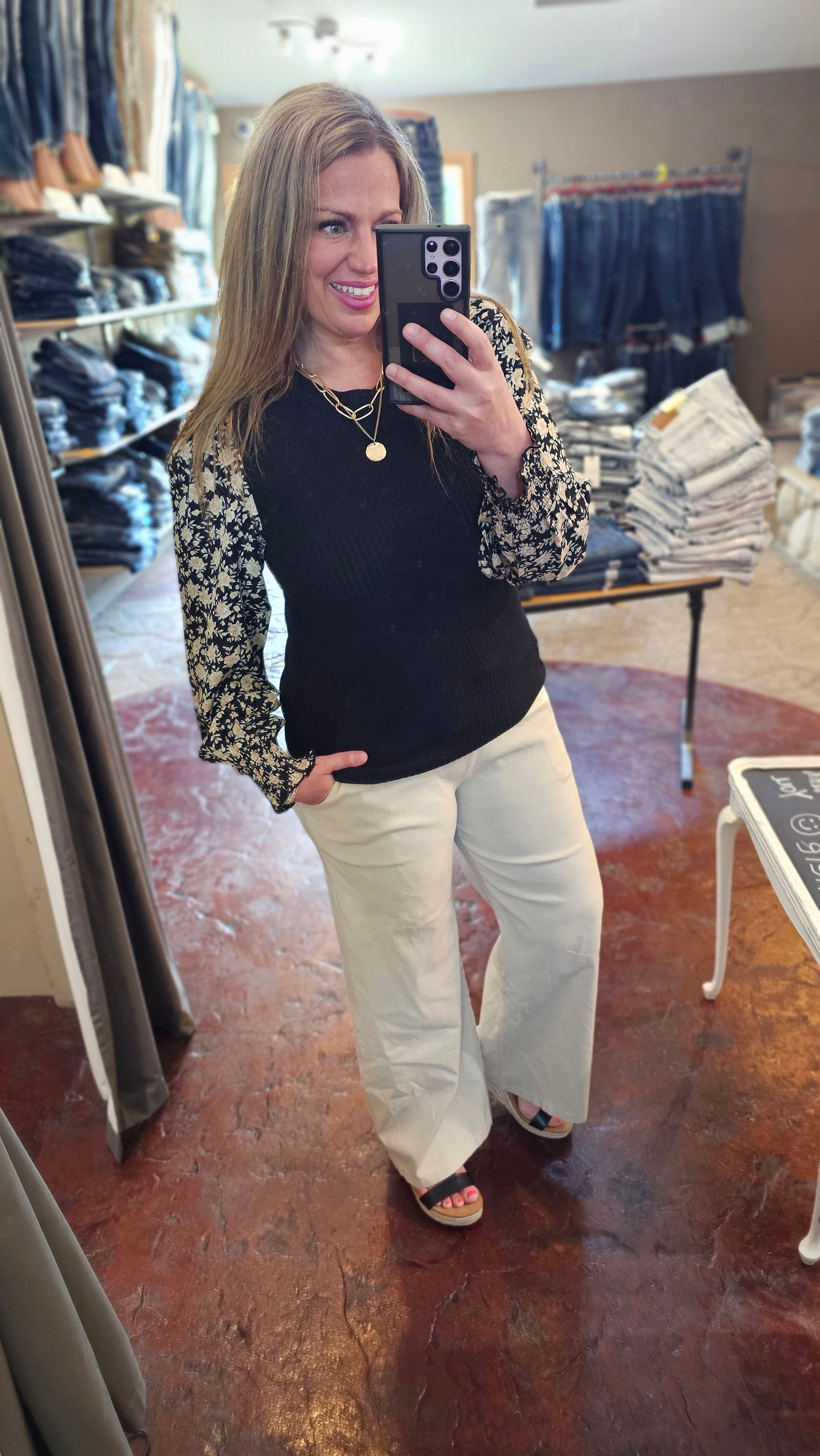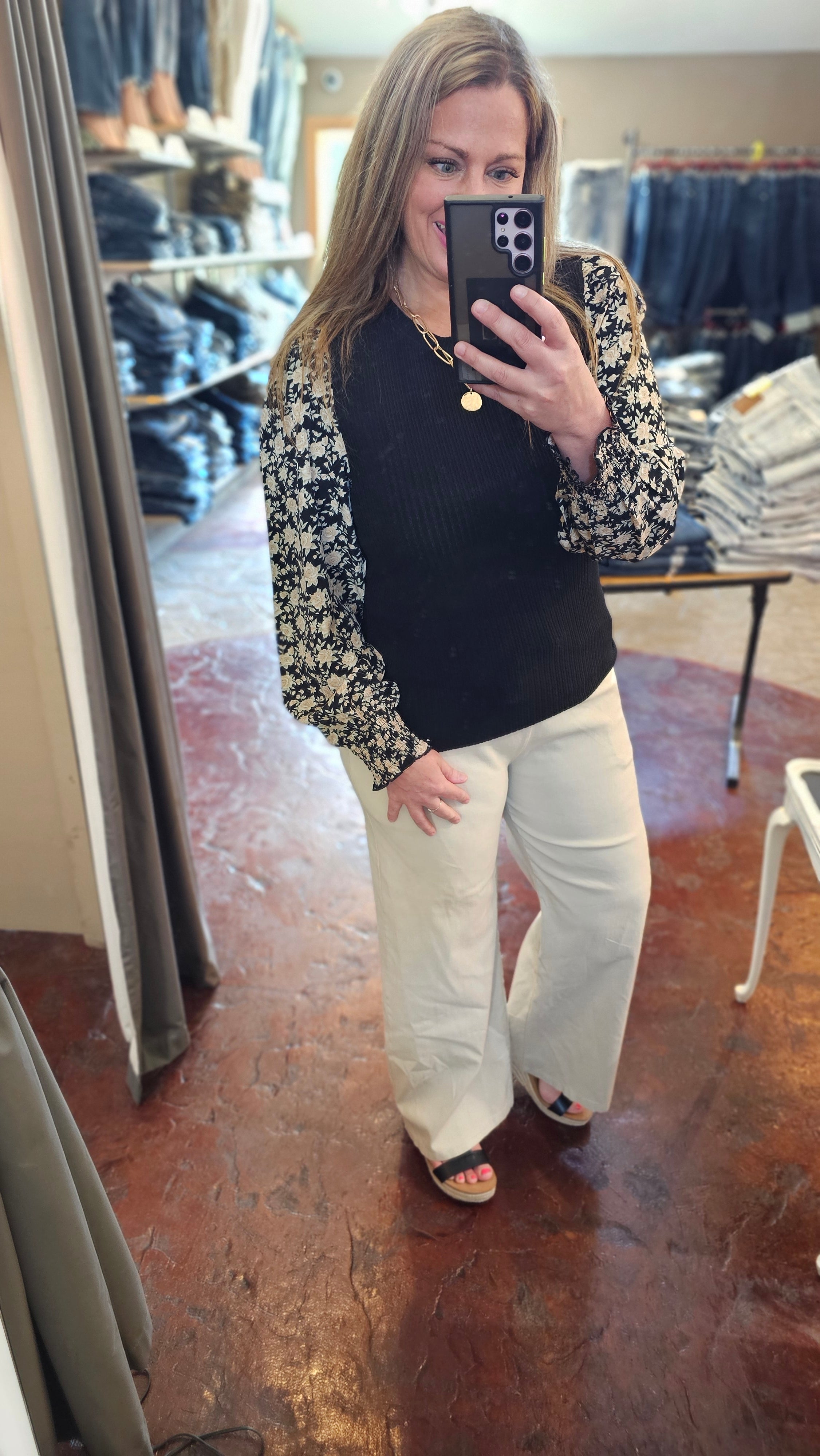 BLACK TEXTURED TOP WITH WOVEN FLORAL SMOCKED CUFF SLEEVE