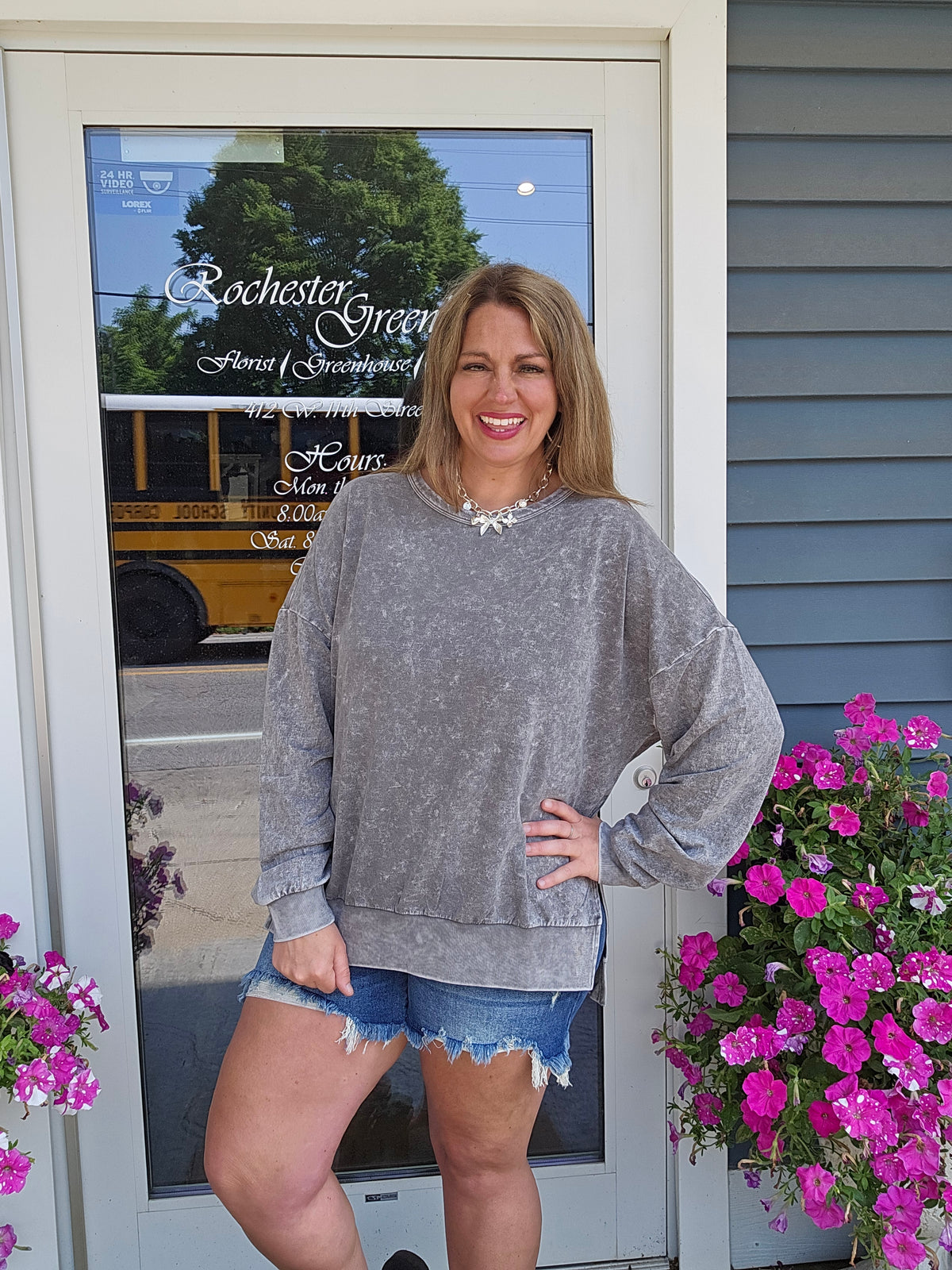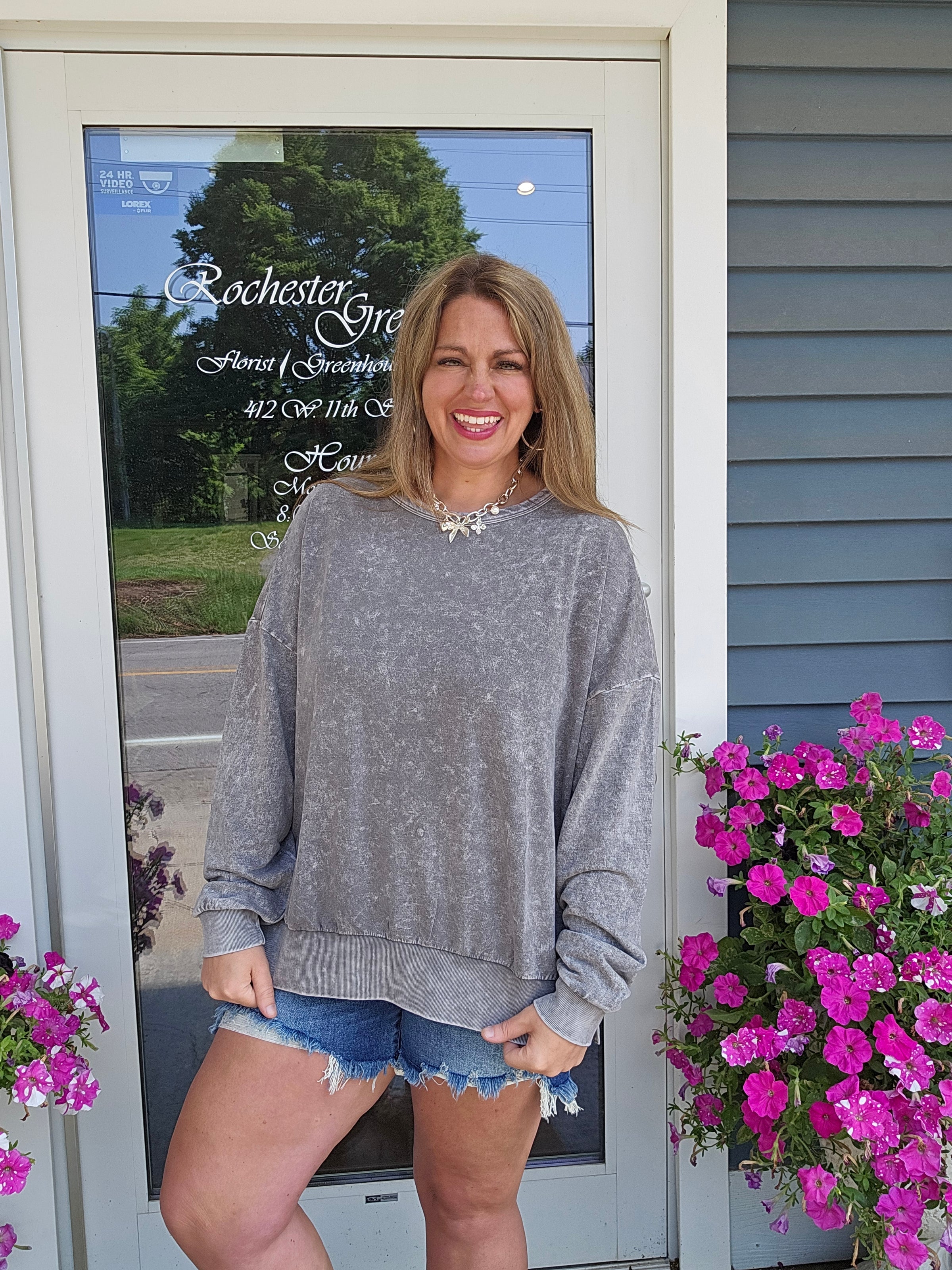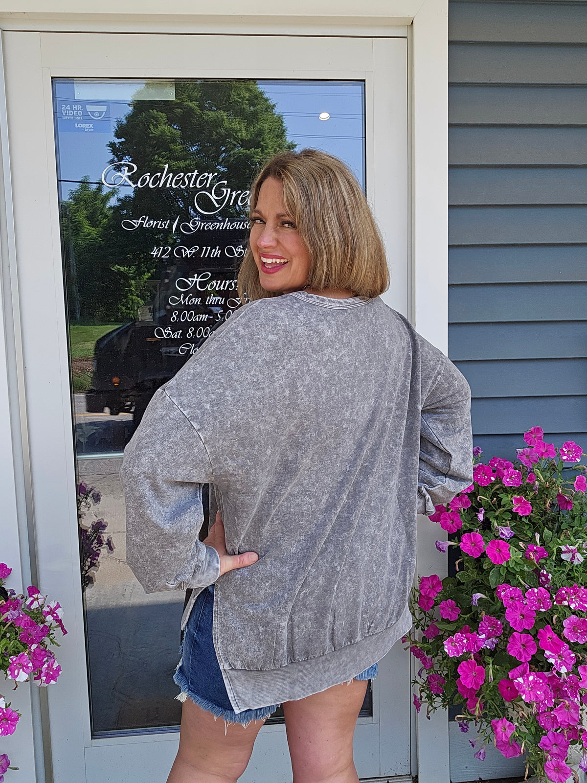 CHARCOAL MINERAL WASH SIDE SPLIT LONG SLEEVE FRECH TERRY TOP