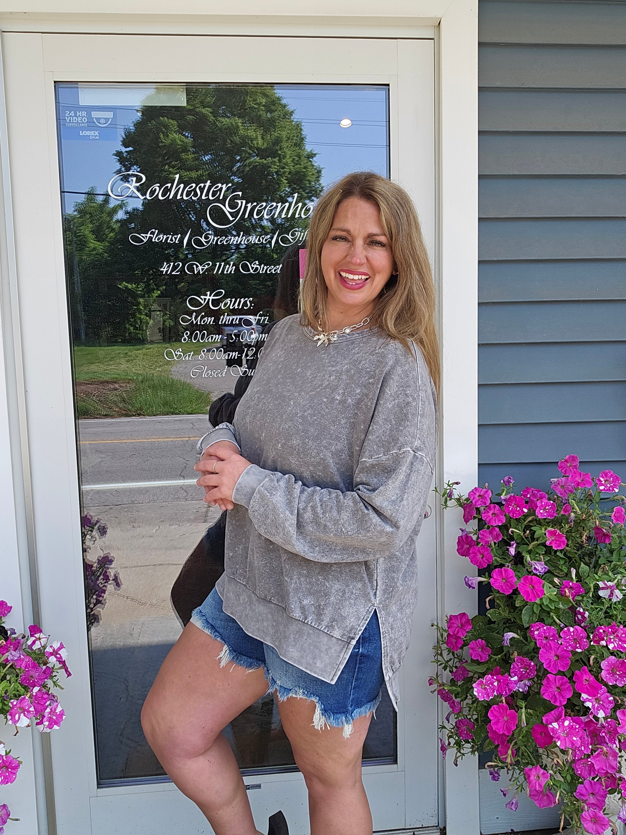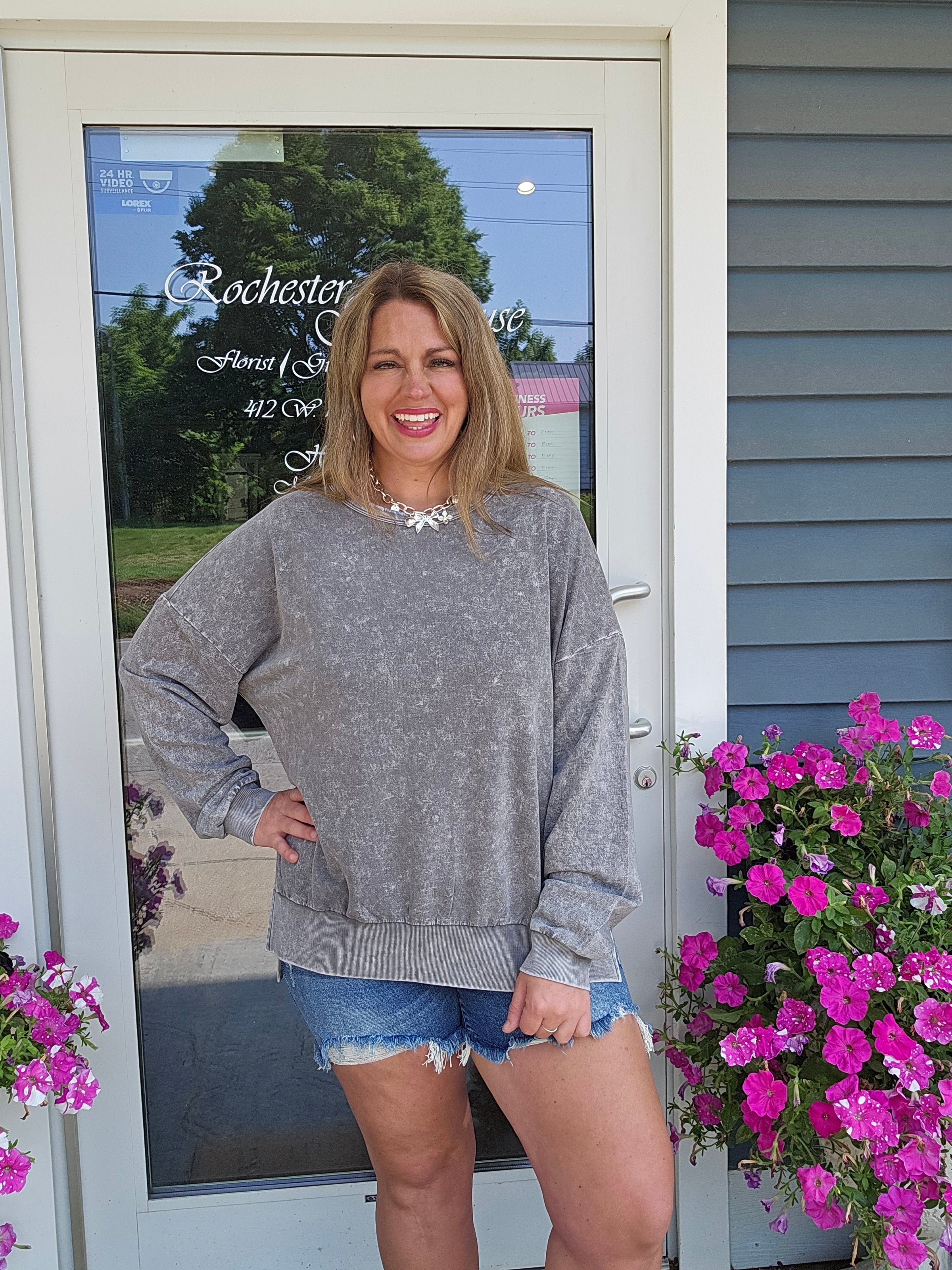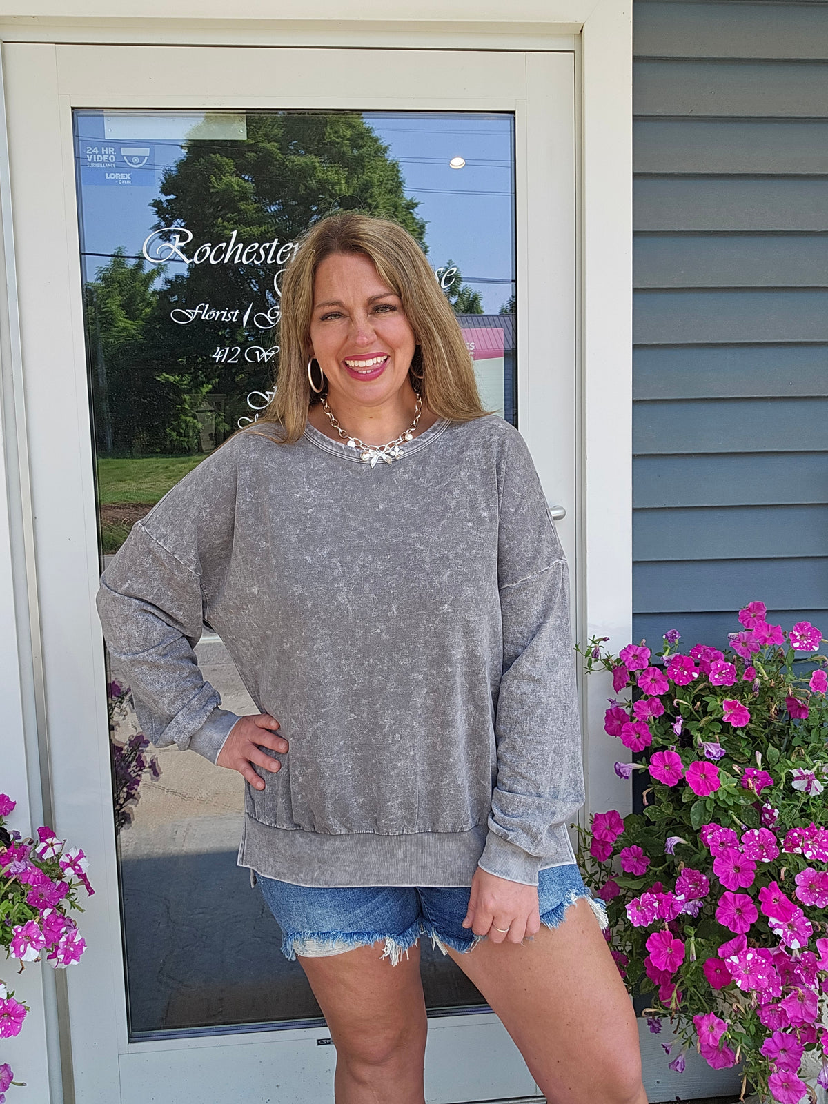 CHARCOAL MINERAL WASH SIDE SPLIT LONG SLEEVE FRECH TERRY TOP
