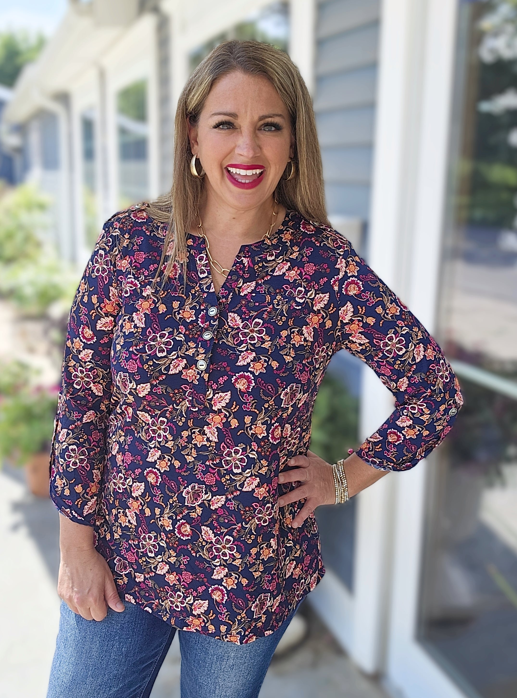 Elevated, effortless, and oh-so-flattering—the Luxe Lizzy is here to level up your wardrobe! This Navy Floral Luxe Lizzy Top features a timeless floral print on a rich navy background, paired with thoughtful details that set it apart. The mandarin neckline is accented by a half button-down front and faux chest pockets for that extra touch of charm.