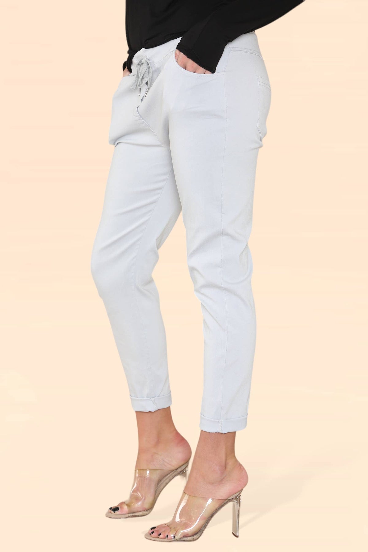 - KM Bestseller * Elasticated stretch waist with tie detail * Two front pockets and two back pockets * Roll up hem Top quality bi-stretch material for comfortable and flattering fit.