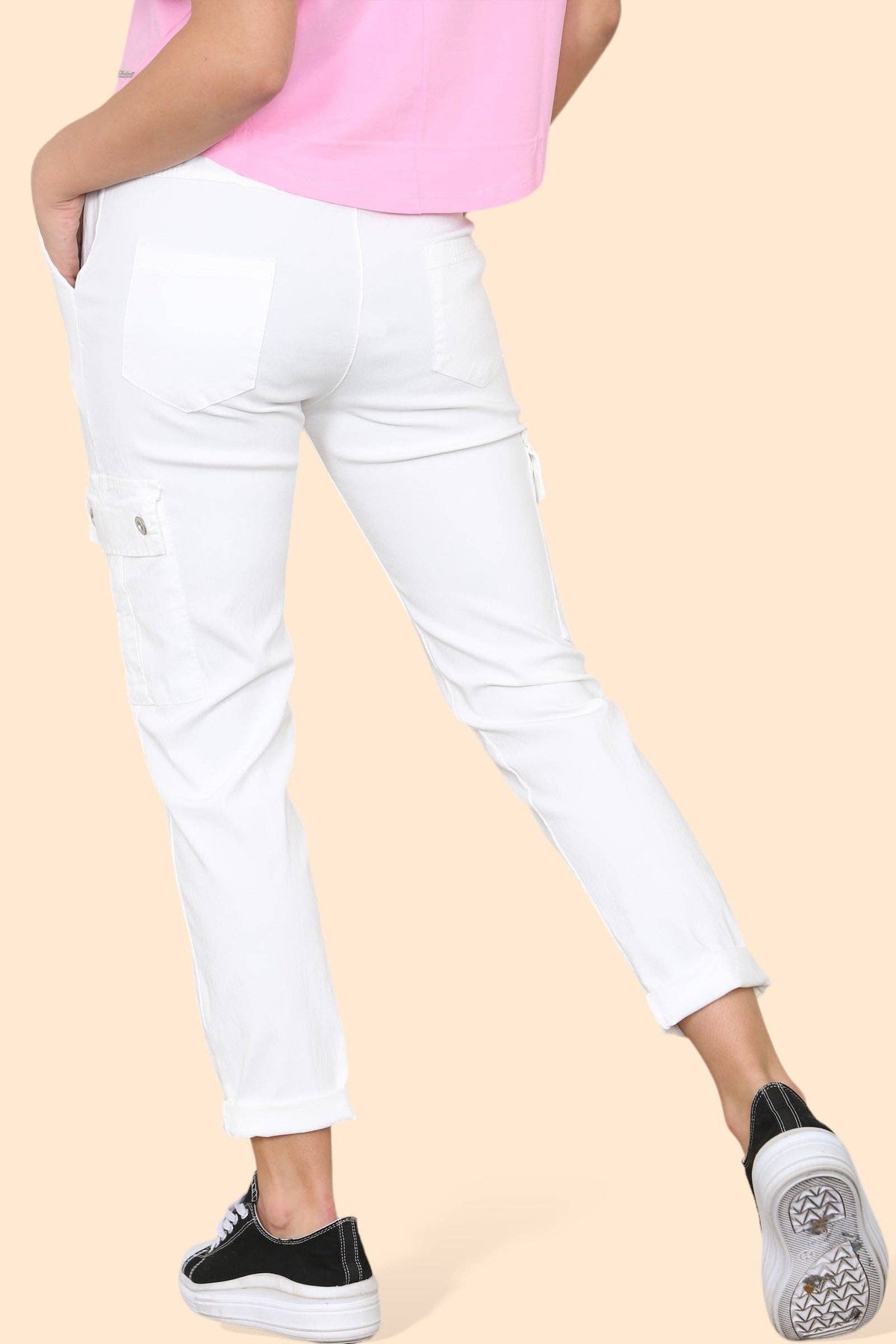 Plain Cargo Stud Pocket Bi-Stretch Magic Trousers: WHITE