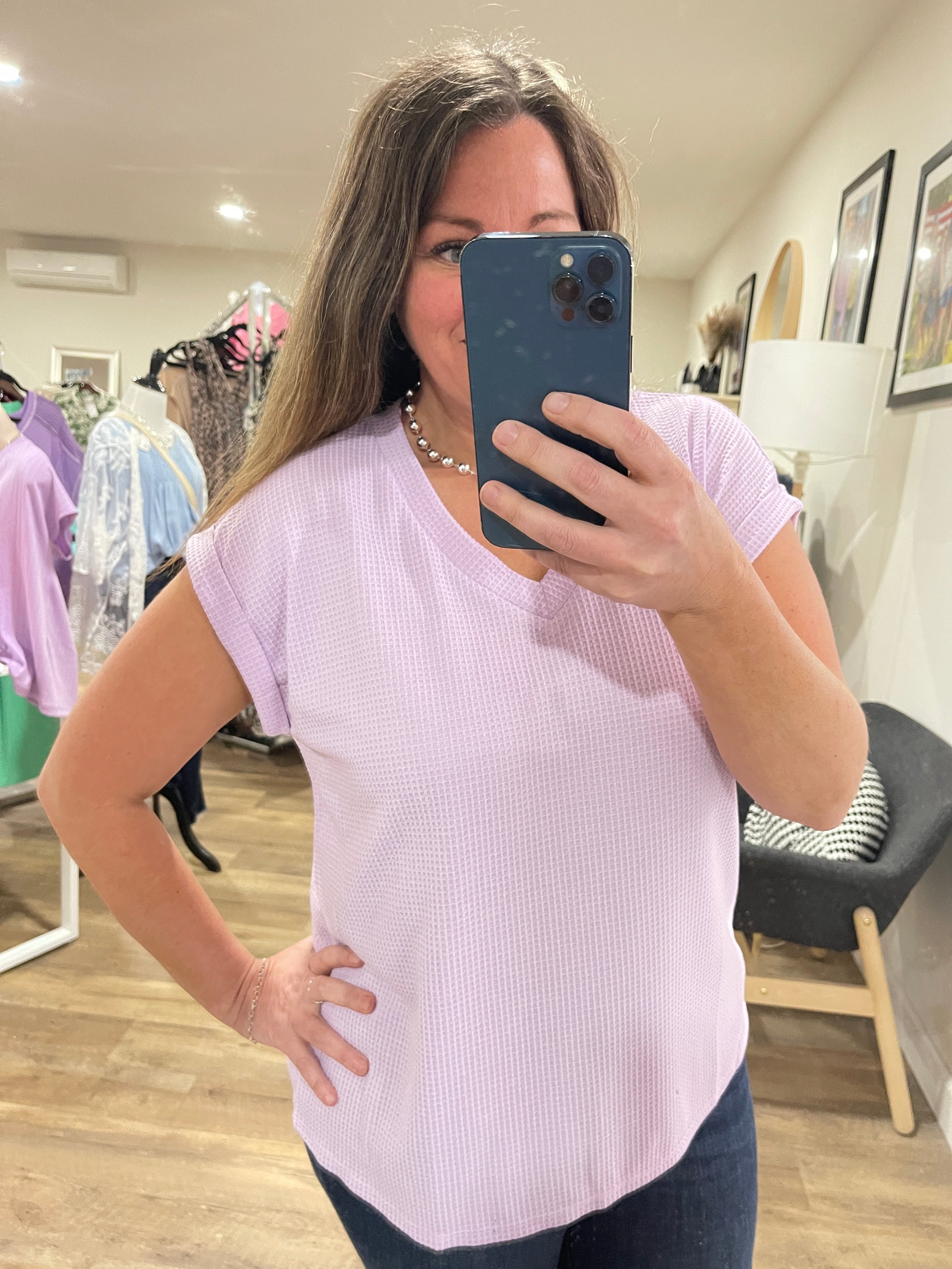 This lilac v-neck top features a soft waffle texture and stylish cuff sleeves. Perfect for an elevated casual look.