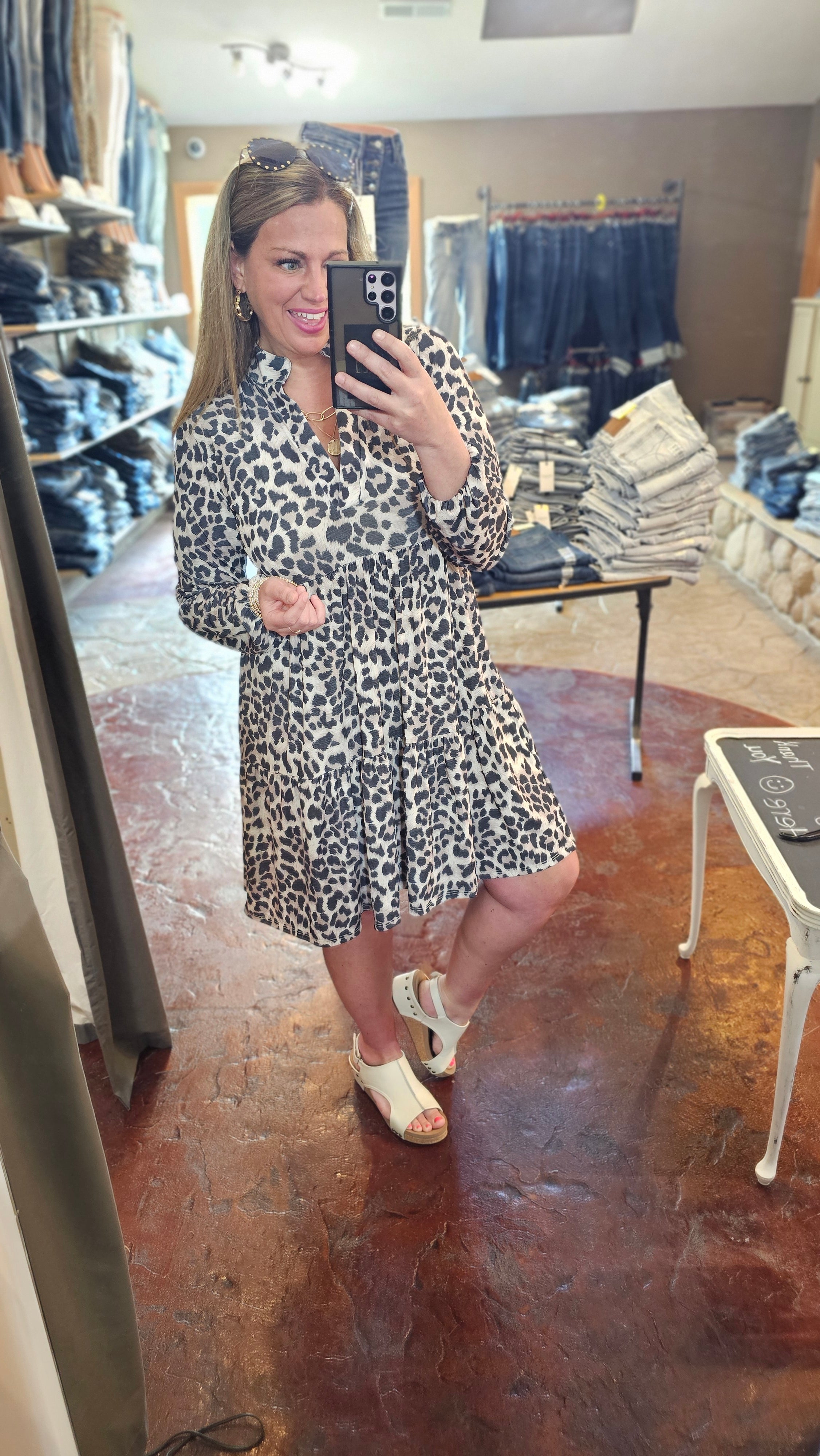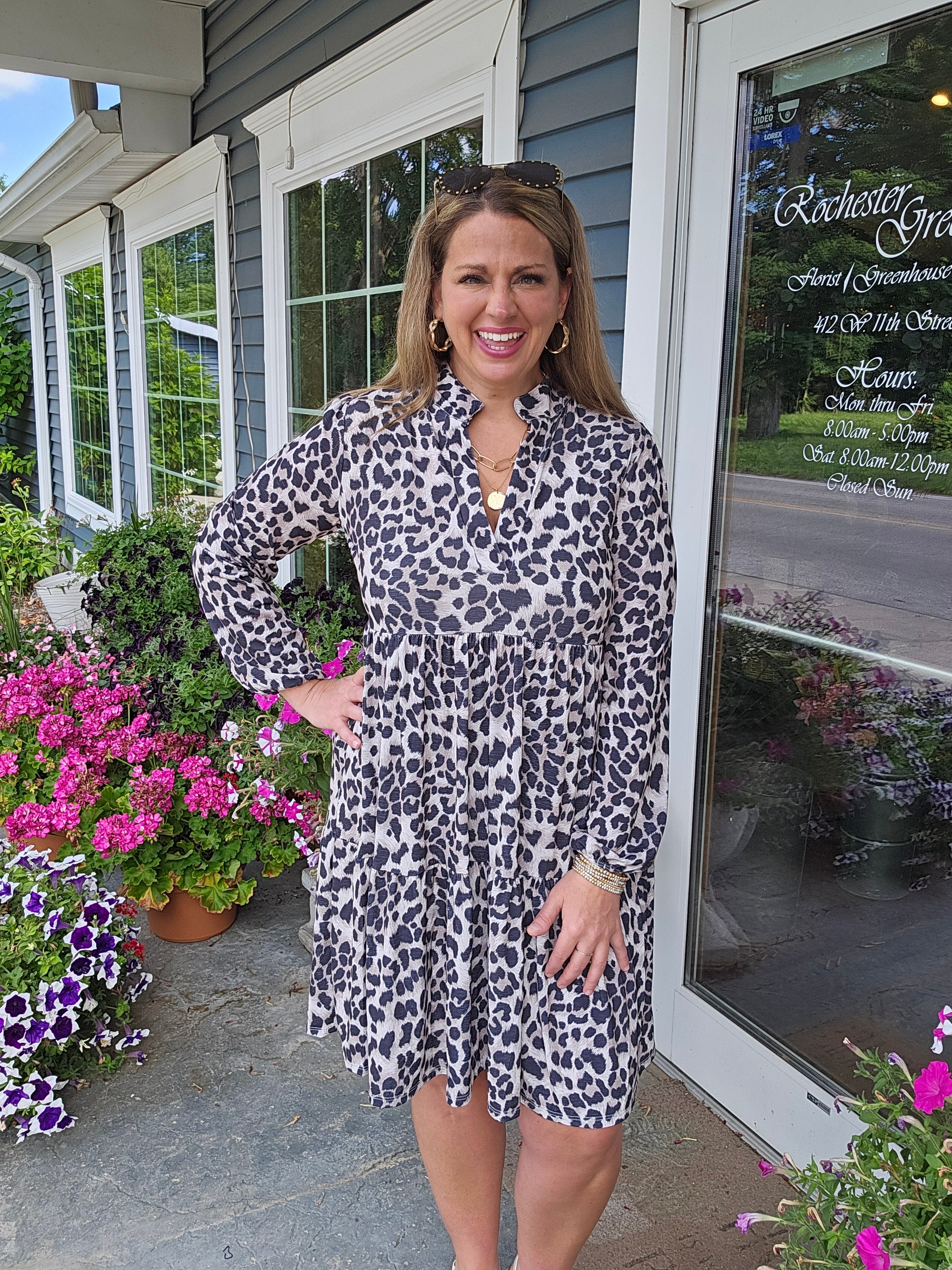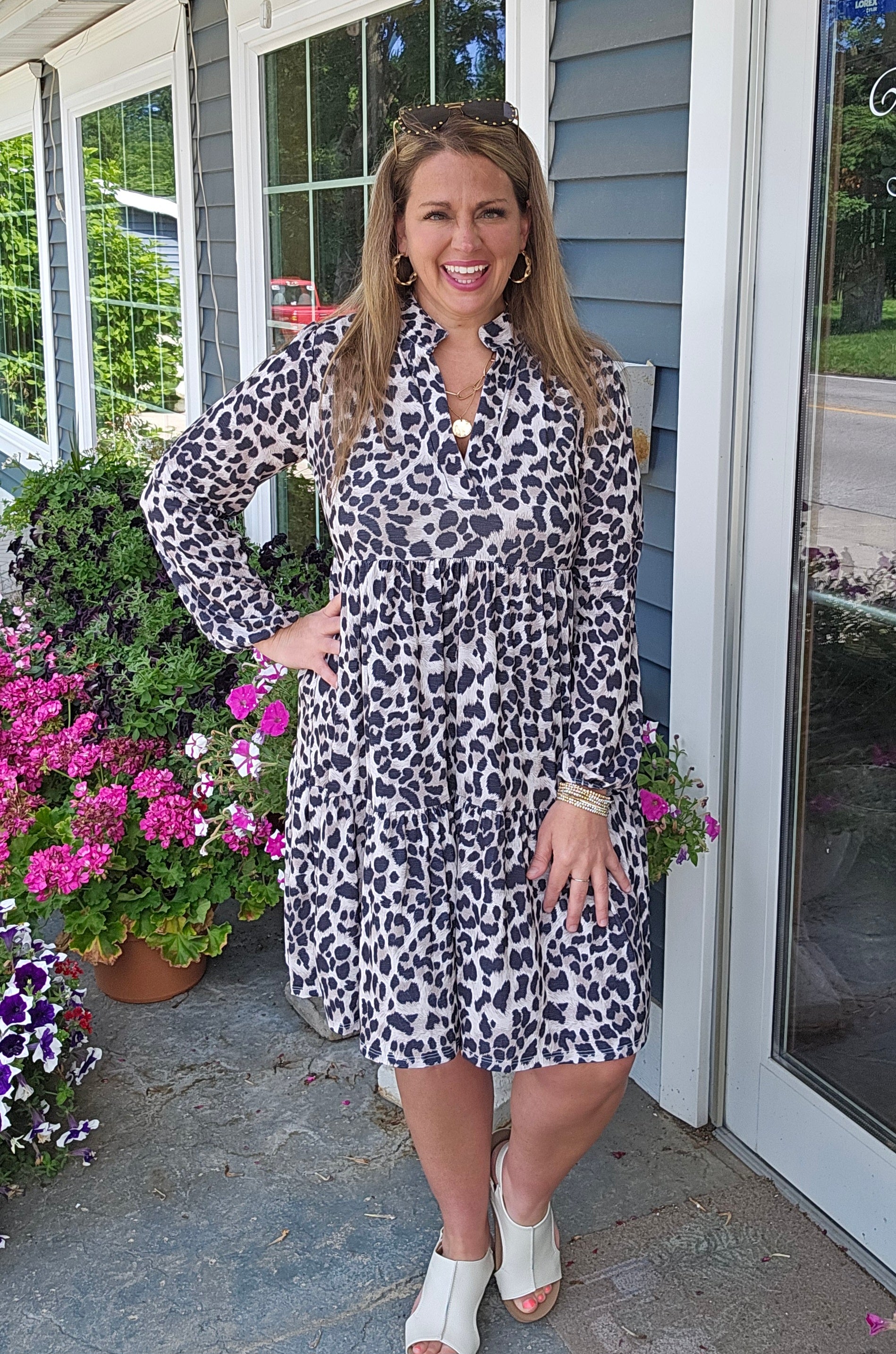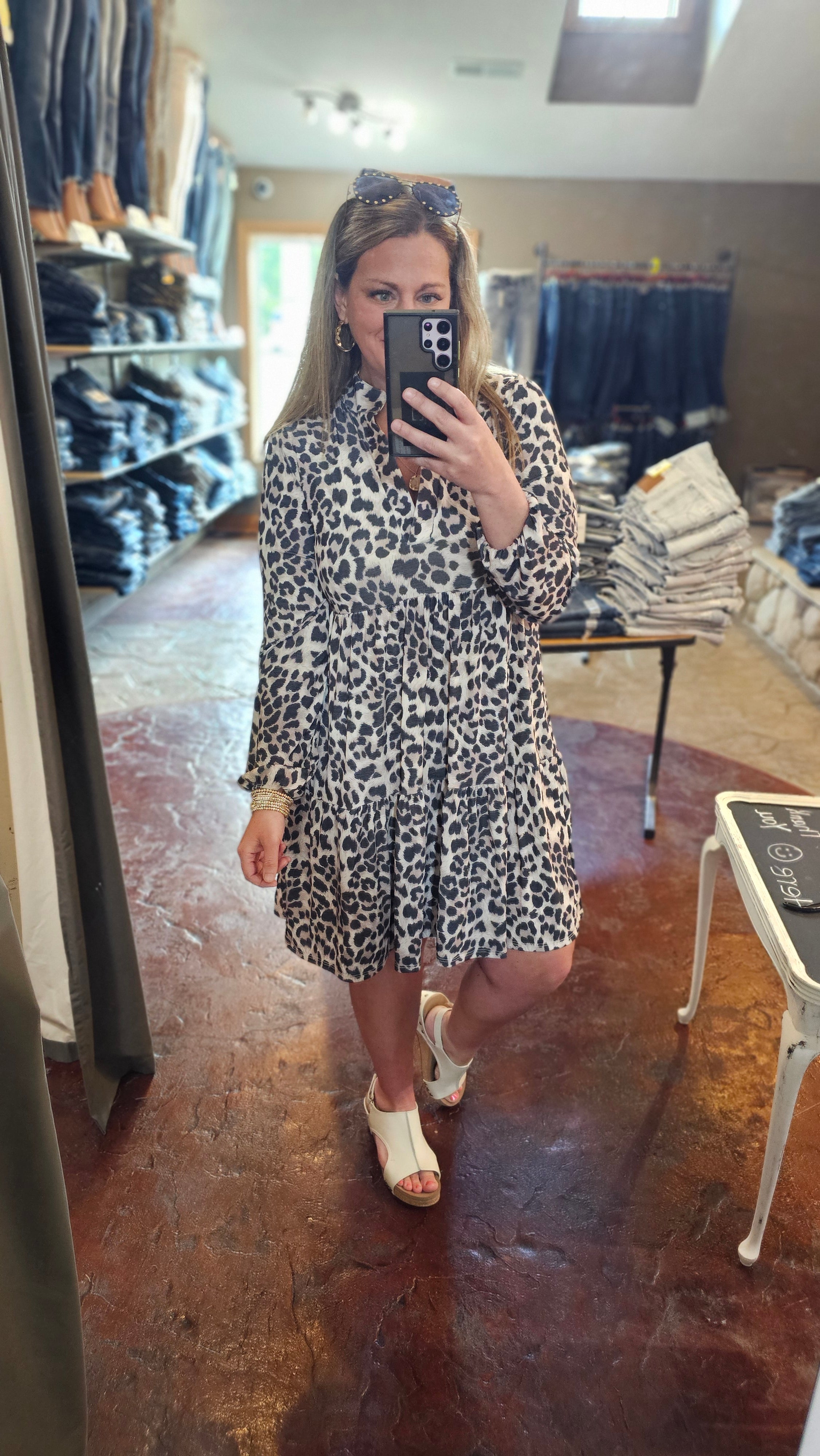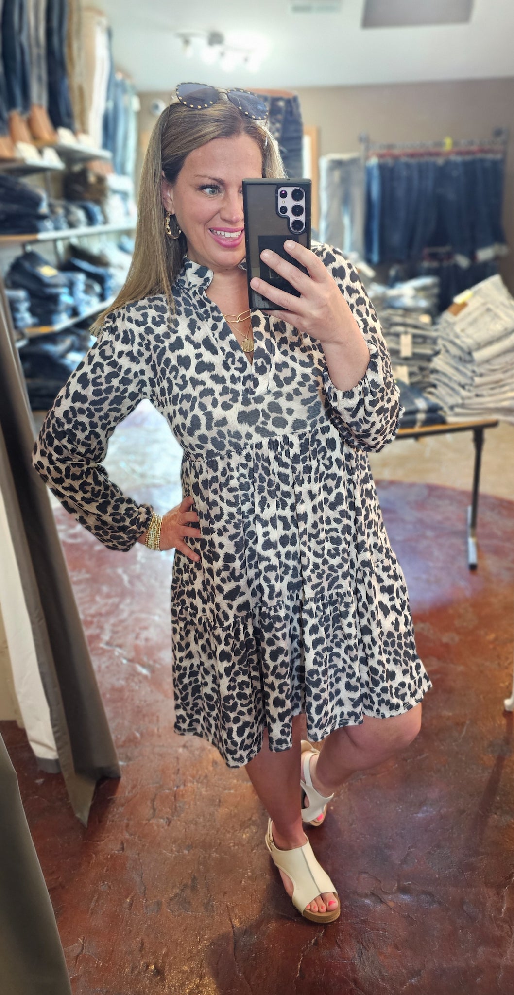 TAUPE ANIMAL PRINT V NECK TIERIED LONG SLEEVE DRESS