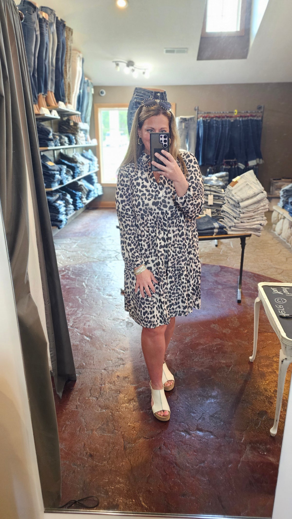 Elevate your wardrobe with this taupe animal print dress featuring a flattering V-neck and tiered long sleeves. The tiered design adds dimension and movement, while the subtle animal pattern offers a sophisticated edge. Perfect for both professional settings and stylish outings, this dress combines comfort with expert tailoring for a polished look.