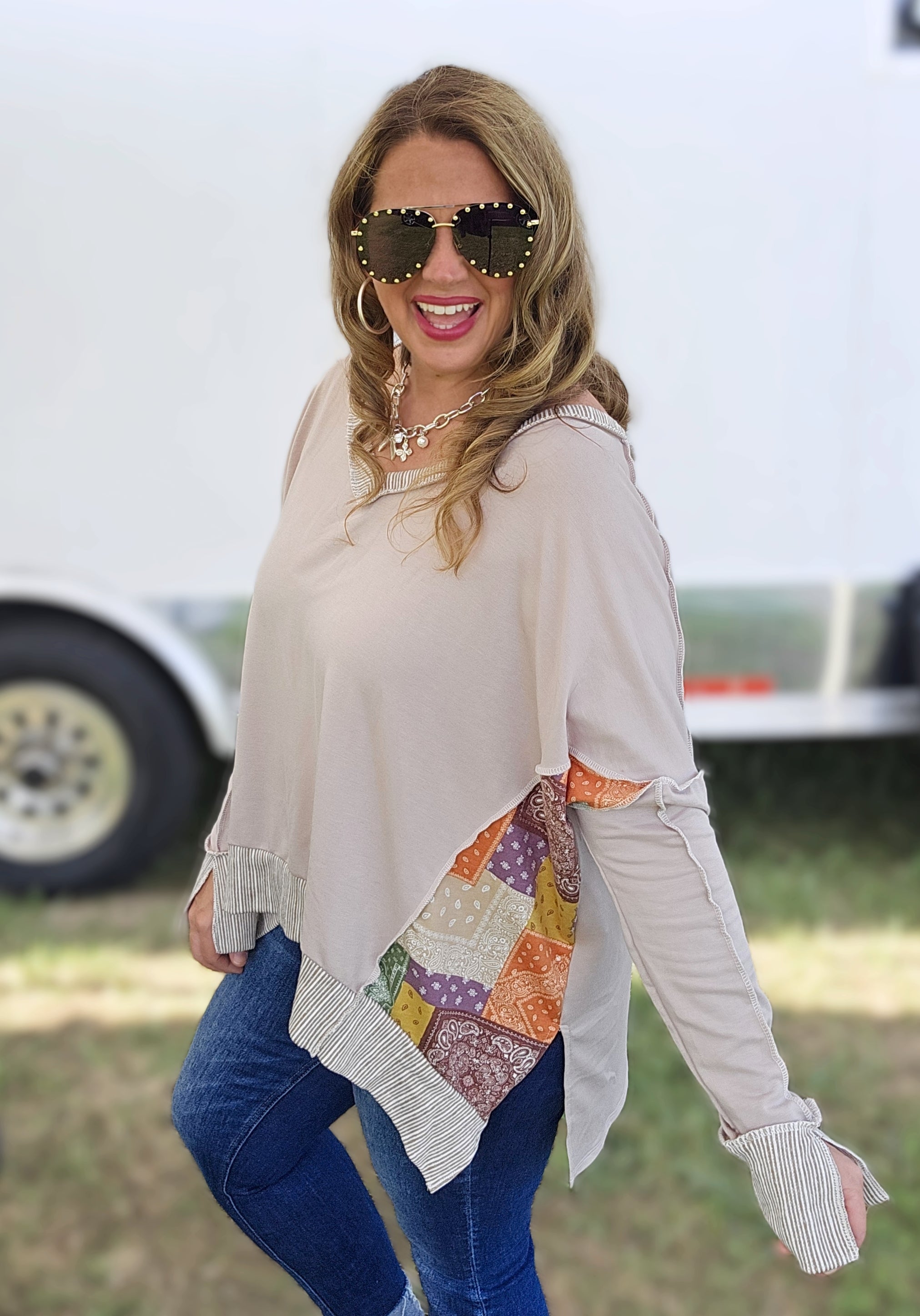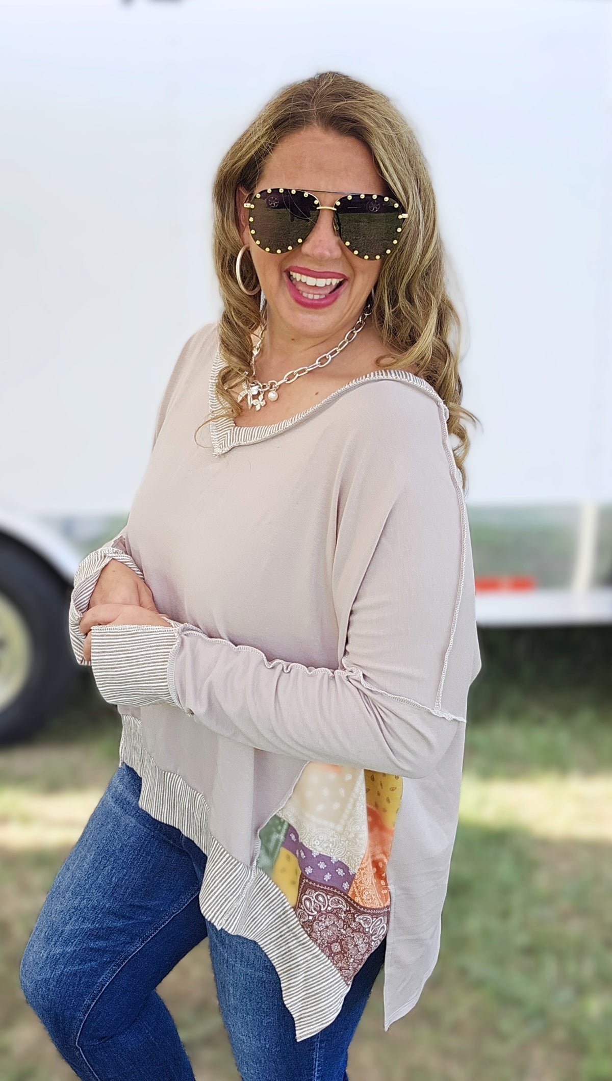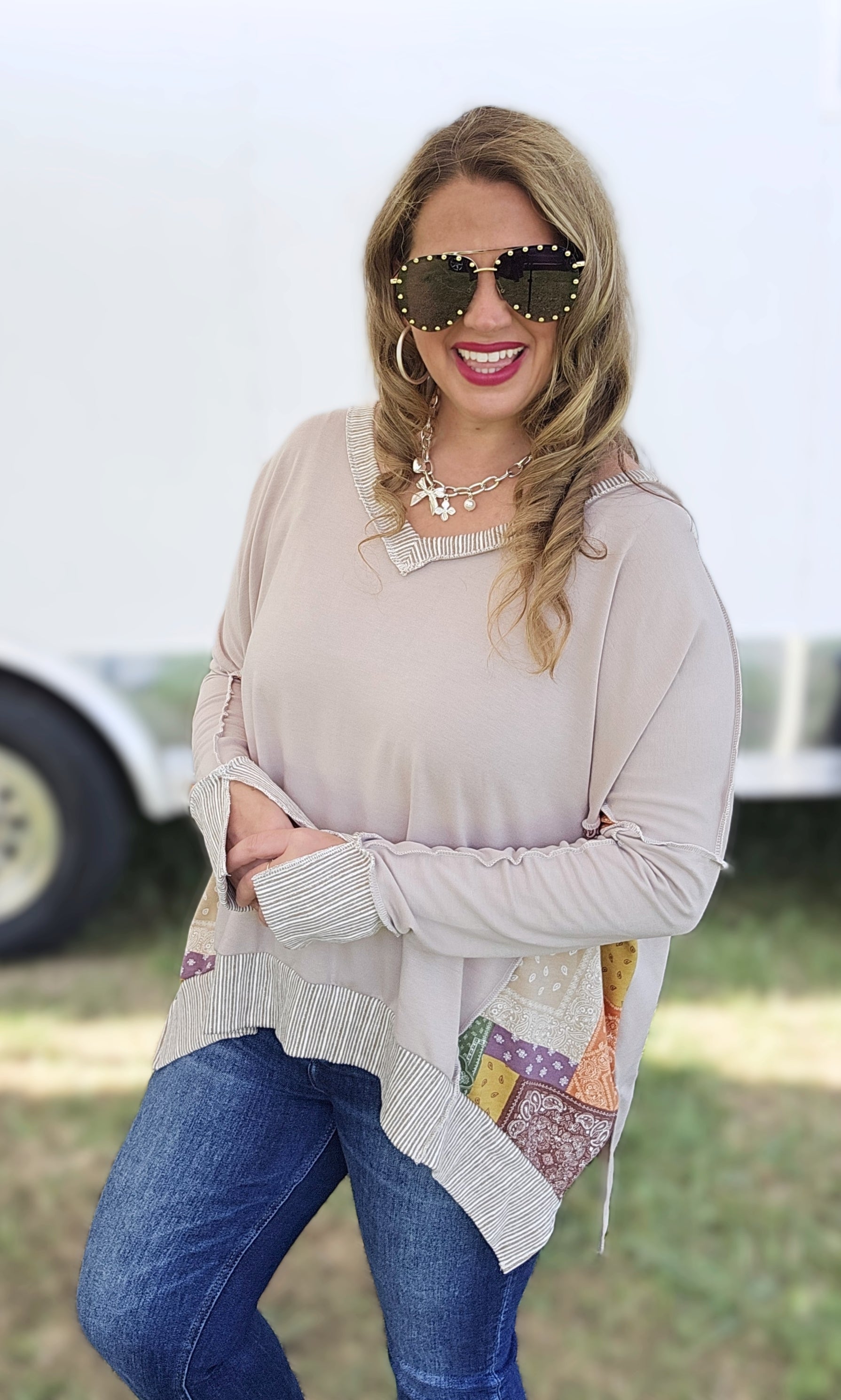 With playful contrast patchwork, a laid-back drop shoulder, and a flattering hi-low hem, this top brings all the cozy feels with a side of boutique flair.