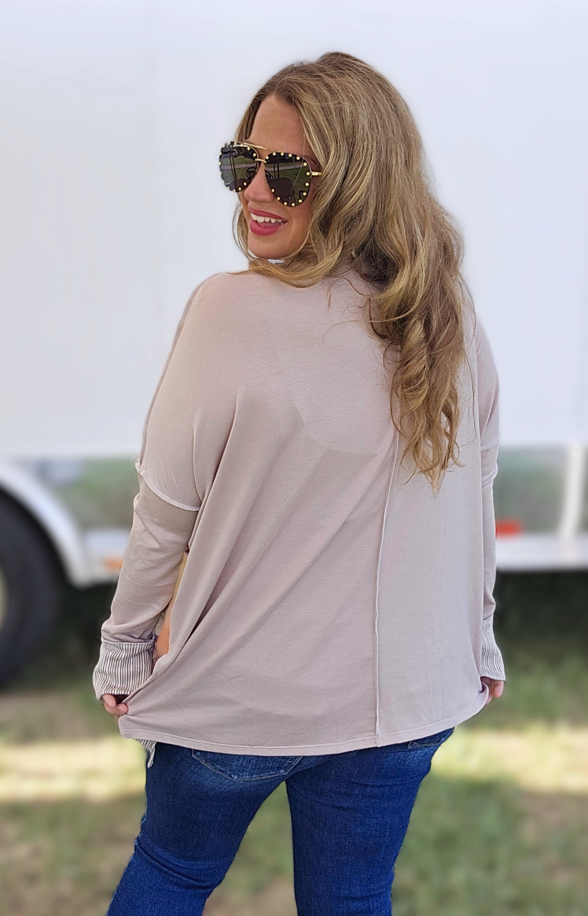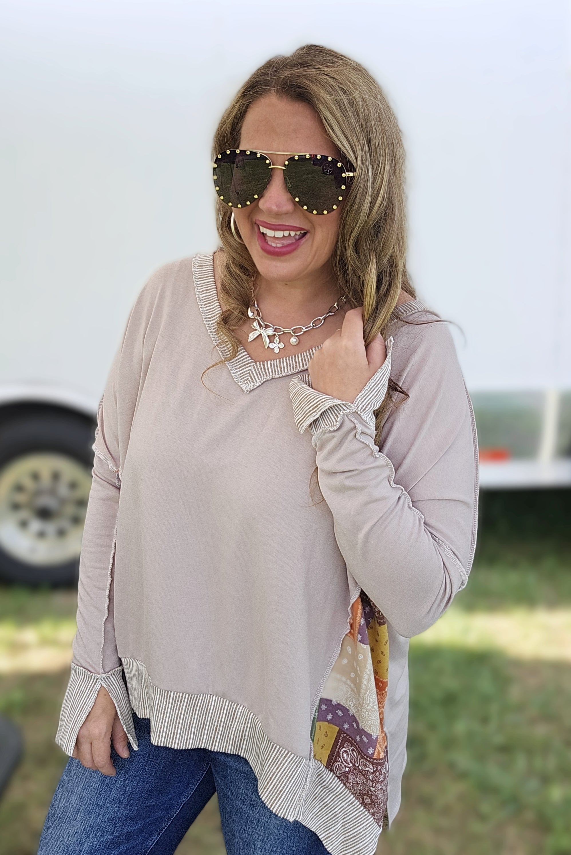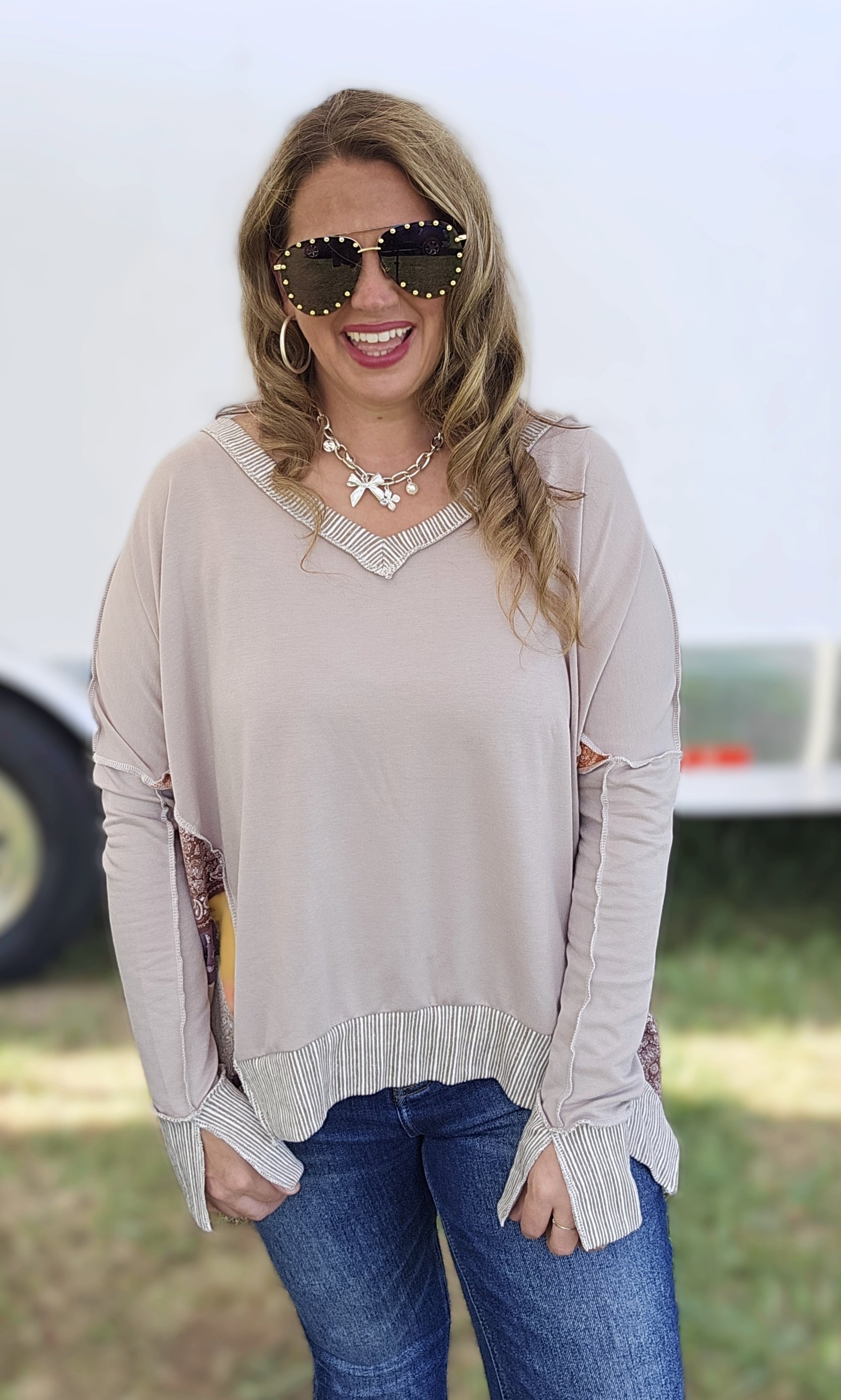 TAUPE CONTRAST PATCHWORK DROP SHOULDER LOOSE FIT TOP